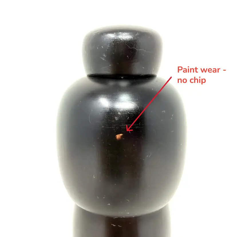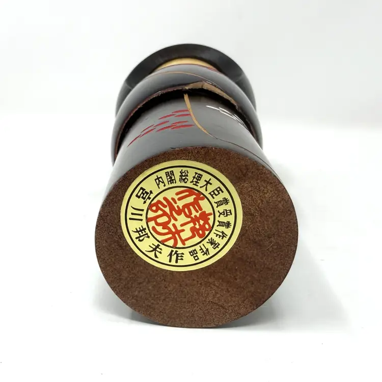 Details: • Maker: Marked and attributed to Kunio Miyakawa • Origin: Japan • Date / Era: Circa 1980s, Late Shōwa period • Design Style: Traditional Japanese Folk Art, Minimalist • Form & Style: Cylindrical kokeshi body, closed-eye expression, hand-painted kimono • Materials: Hand-turned wood with painted lacquer finish • Colors: Black ground with red, white, and gold accents • Dimensions: Height: 8.5 inches, Diameter: approx. 3 inches, Weight: approx. 10 oz • Markings: Gold paper label with red seal (Japanese text)
