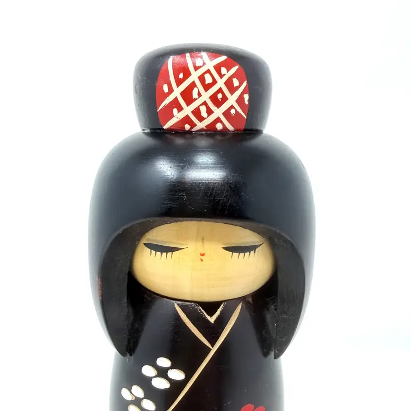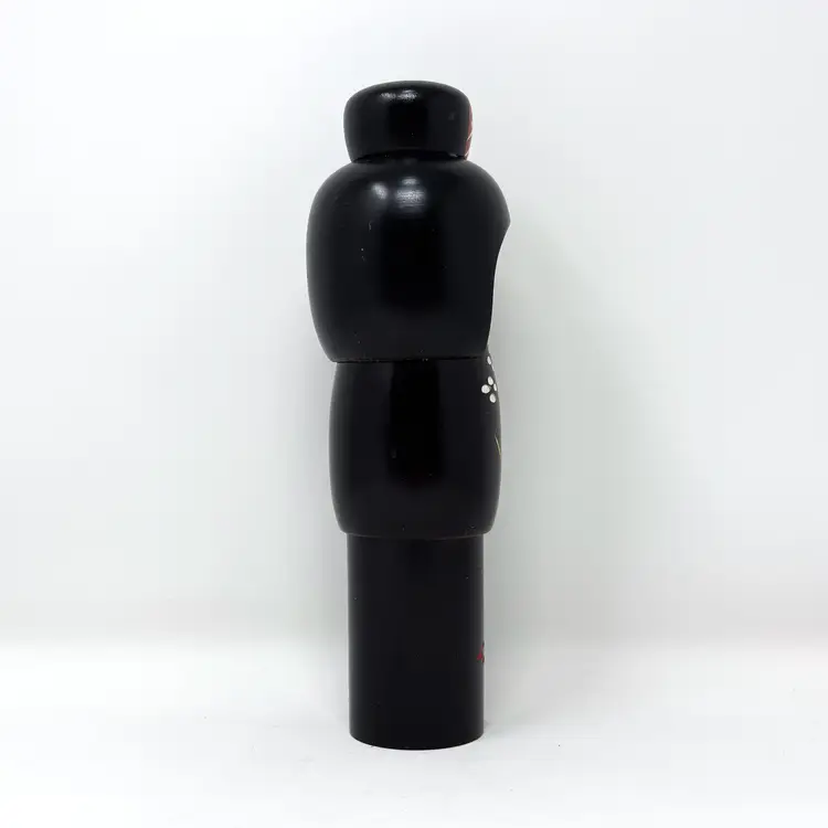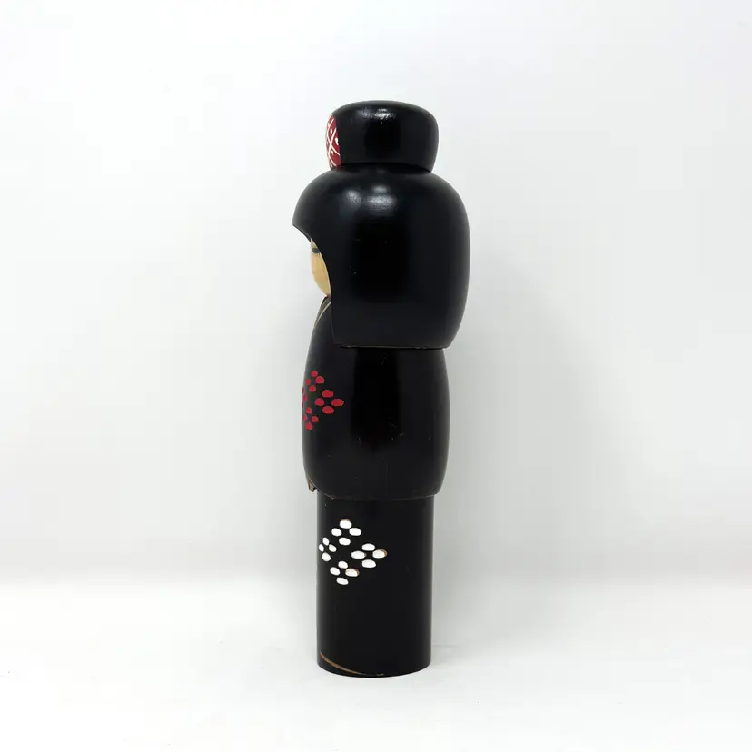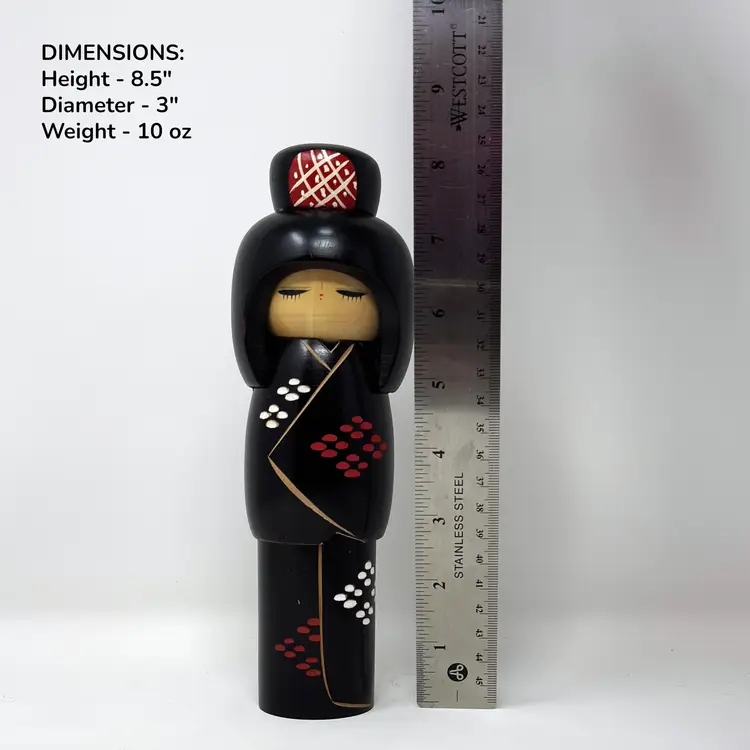 This vintage Japanese kokeshi doll is a hand-turned wooden figure finished in a deep black lacquer with delicate red, white, and gold painted kimono details. Measuring 8.5 inches tall, it features the calm, closed-eye expression and elegant restraint collectors associate with late 20th-century traditional kokeshi work.