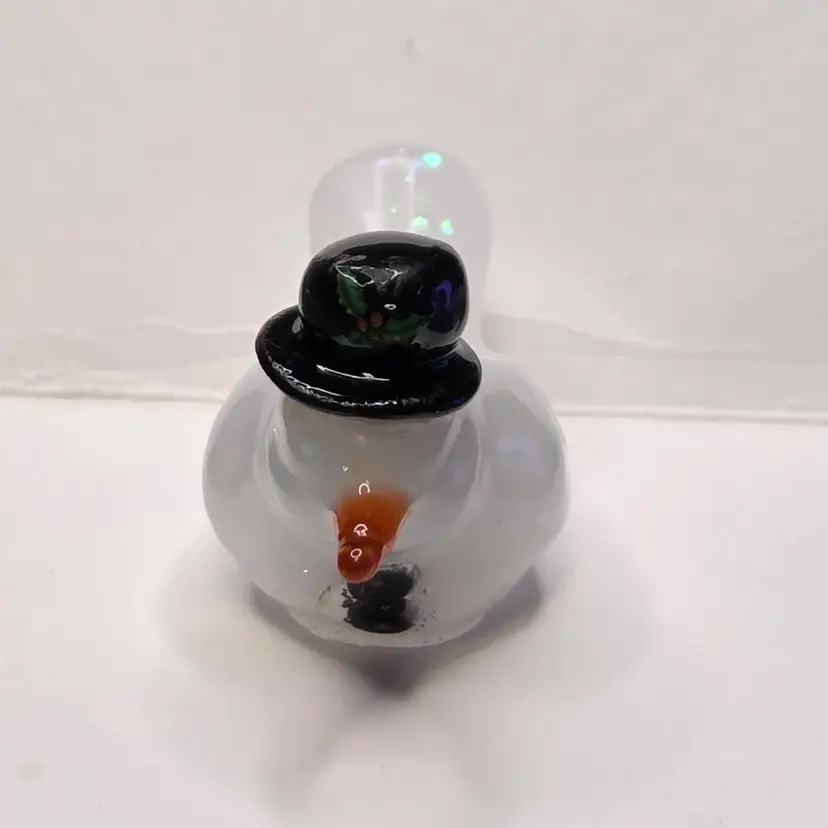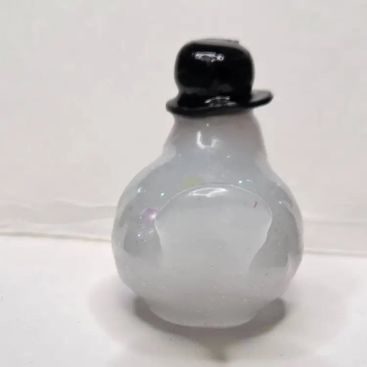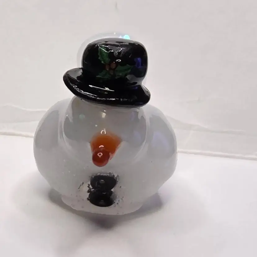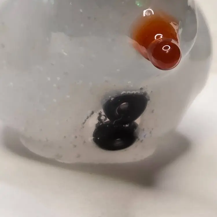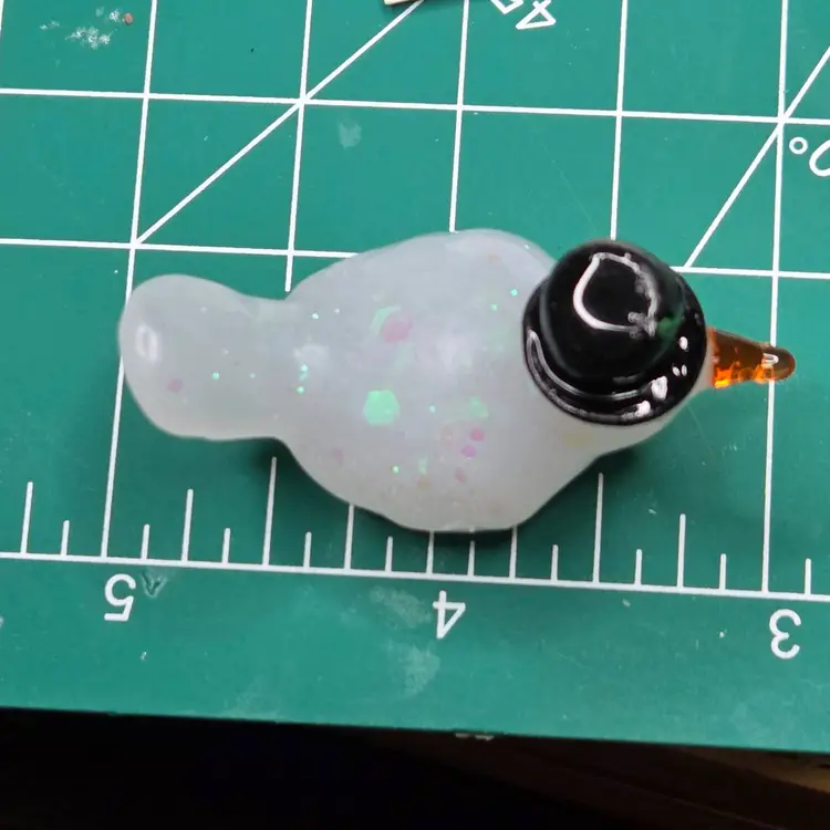 He is made with a mix of resin and snowy chunky glitter. He has a winter hat made from polymer clay and two buttons also made from polymer clay. He has a carrot shaped resin nose.