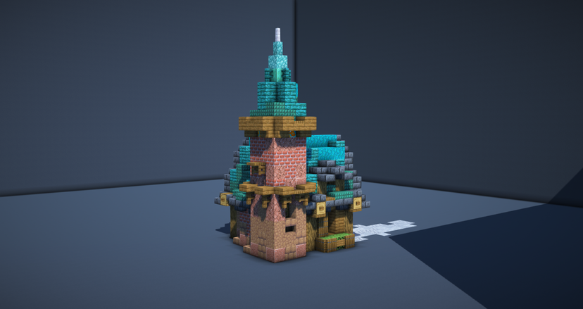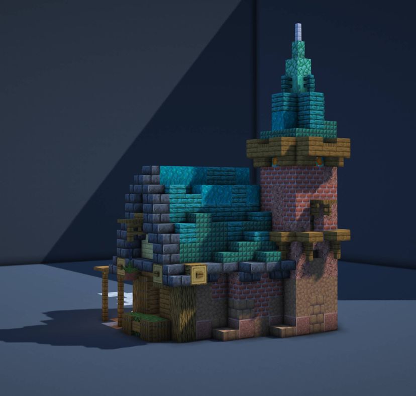 Key feature(s): • Weathered brick tower • Wooden overhang for outdoor storage • Intricate spruce and deepslate trims
