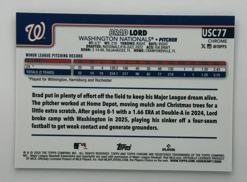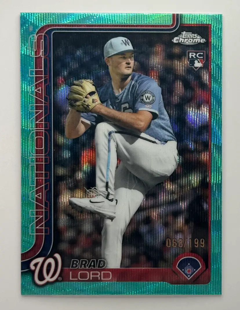 Check out this Brad Lord rookie card from Topps Chrome, showcasing the Nationals pitcher in action. Limited edition, numbered 68 out of 199.