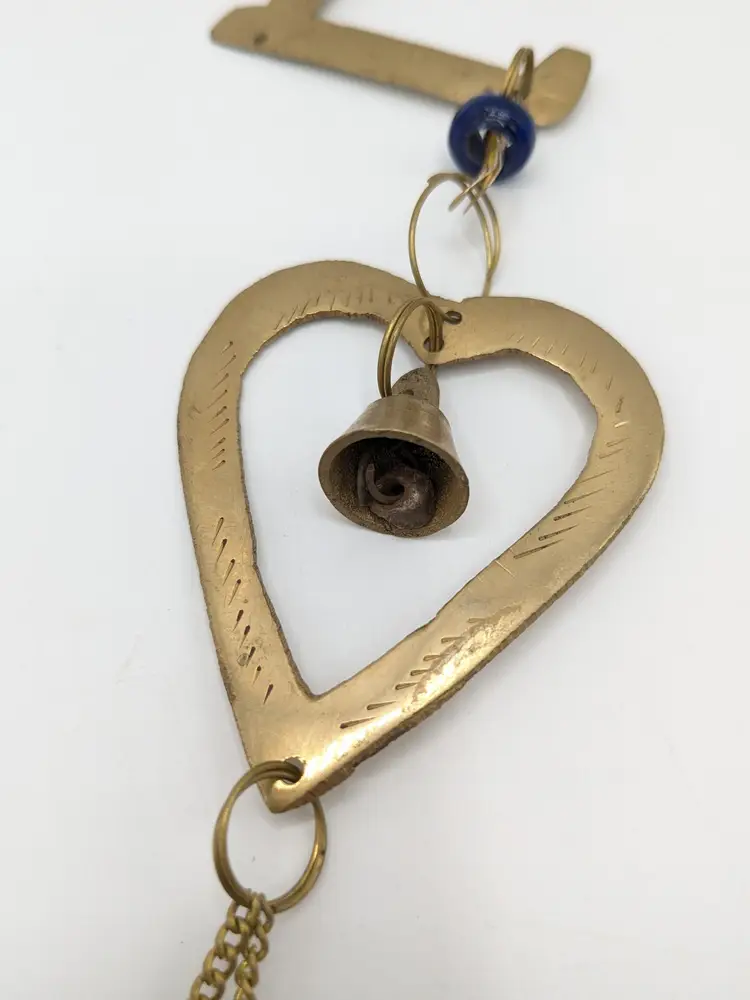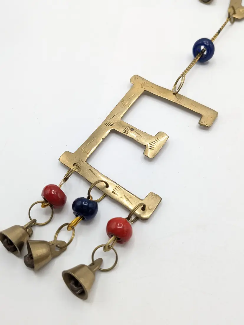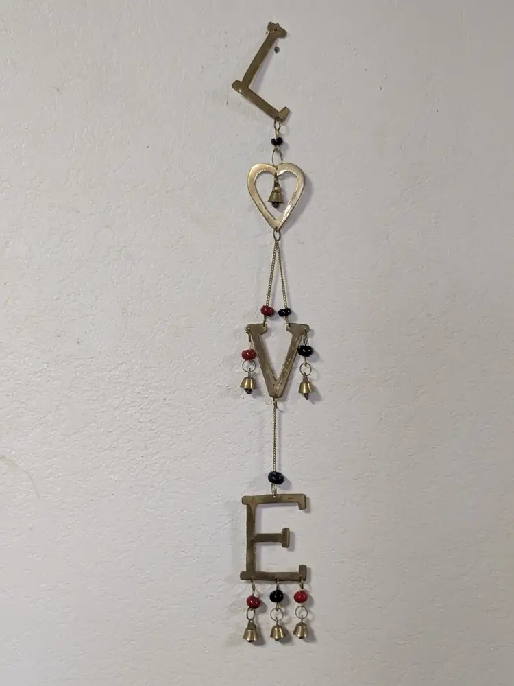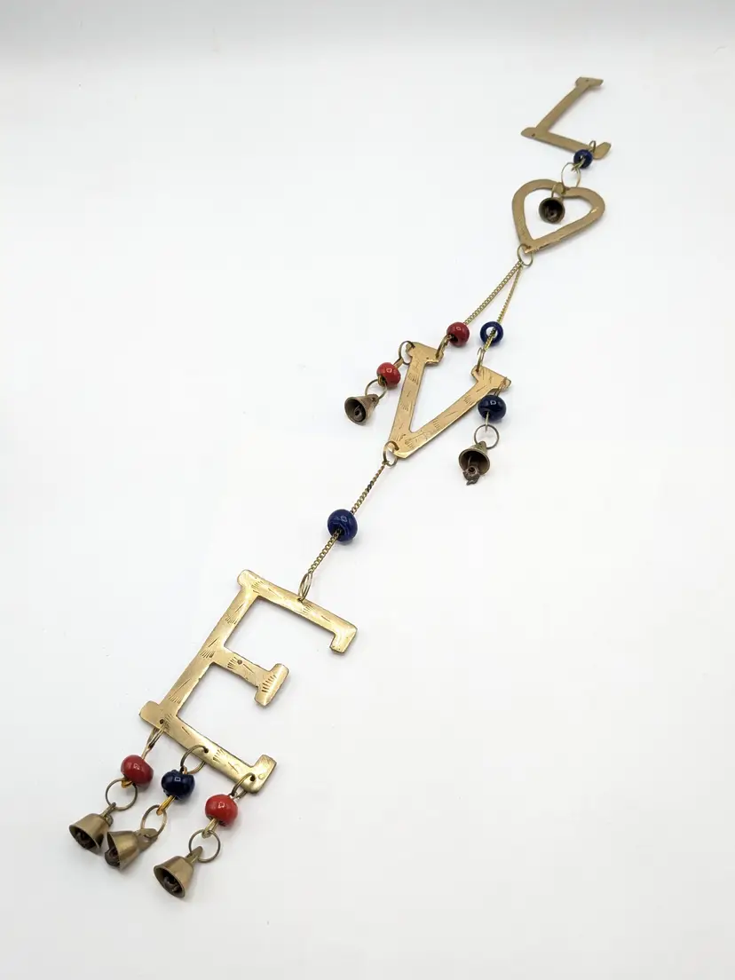 Good condition. READ: The 'L' is missing its strand of beads and bell. Could be easily fixed. Features etching on the brass letters. Beads are a dark blue and red. Valentine decor. Measures 20" in length and 2 1/4" wide. ENS