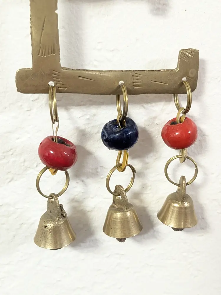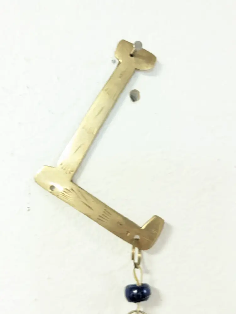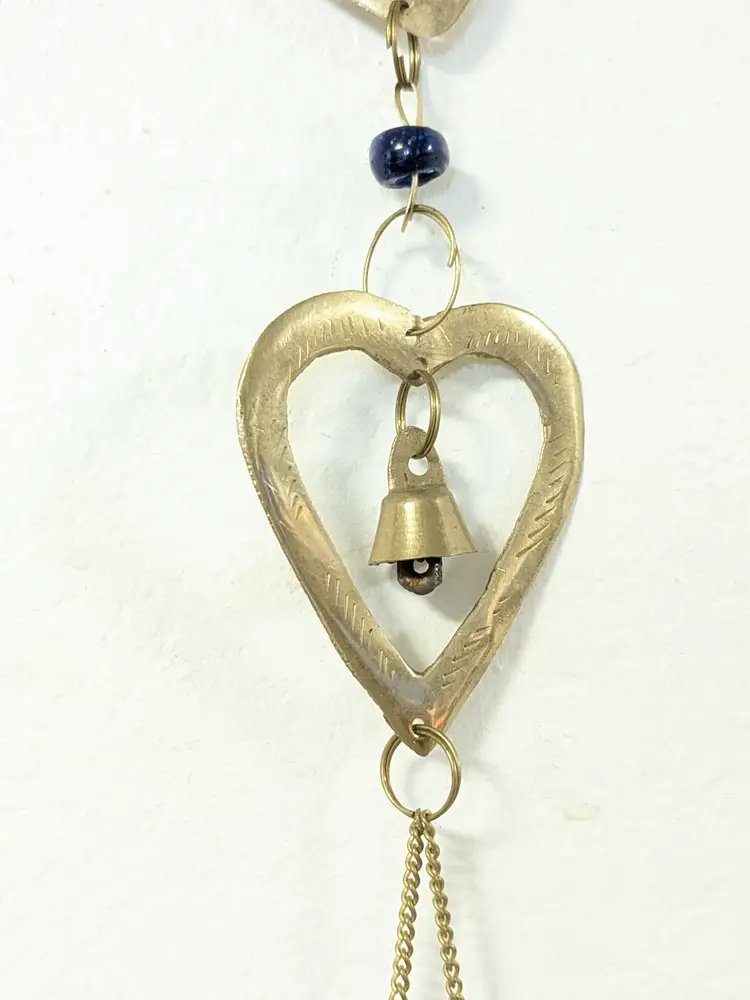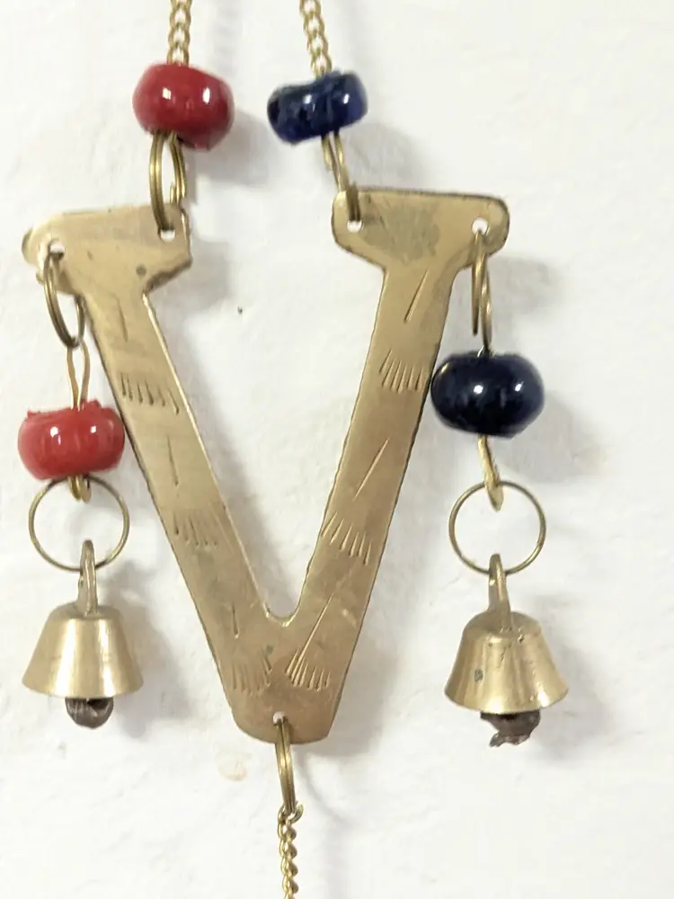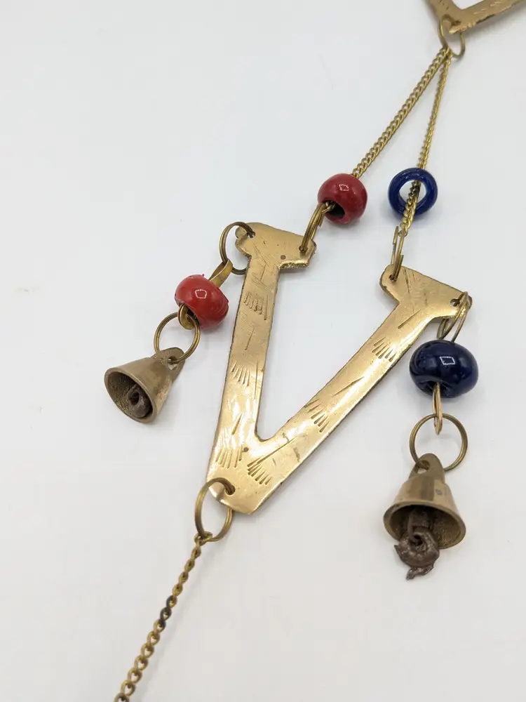 Good condition. READ: The 'L' is missing its strand of beads and bell. Could be easily fixed. Features etching on the brass letters. Beads are a dark blue and red. Valentine decor. Measures 20" in length and 2 1/4" wide. ENS