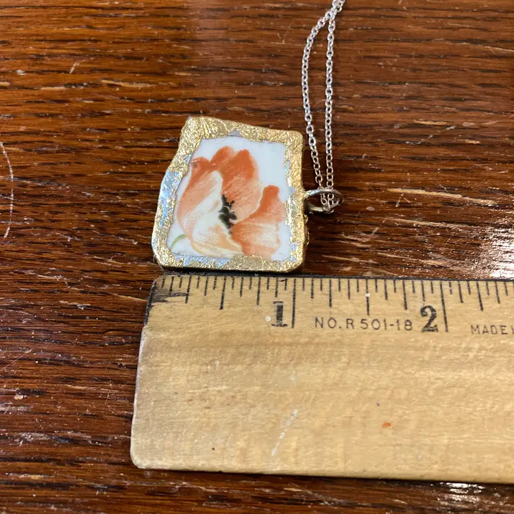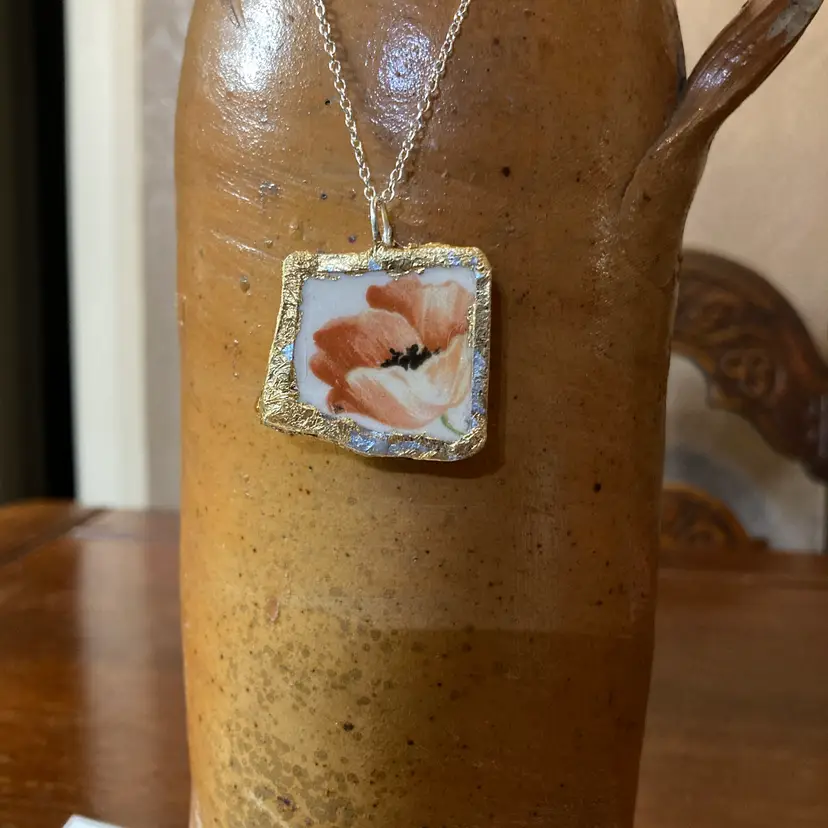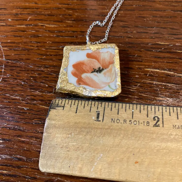 This whimsical poppy pendant transforms ceramic shards into wearable art. Handmade from a broken plate piece, This necklace is a quirky celebration of creative reuse—no two are exactly alike. The cheerful poppy design pops at just 1" x 1.25", making it the perfect statement piece for anyone who loves artisanal charm with a playful twist. A gift that says "I appreciate your one-of-a-kind style."