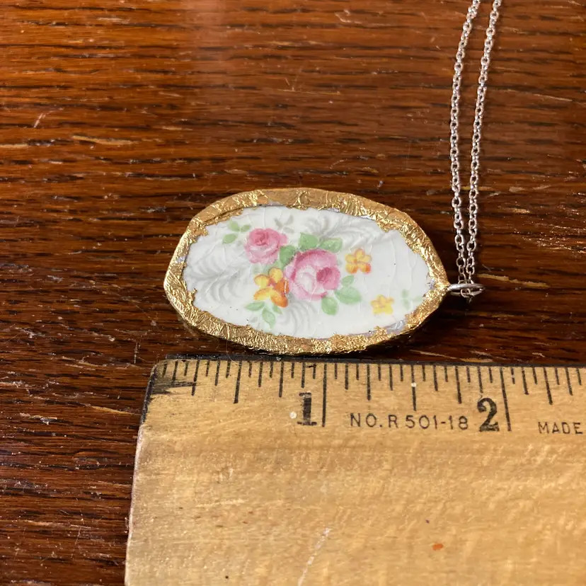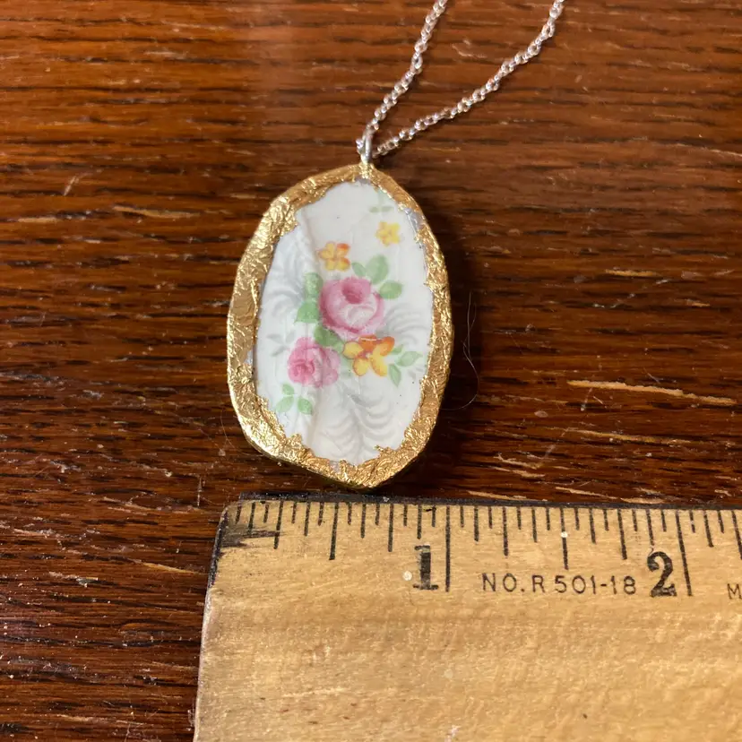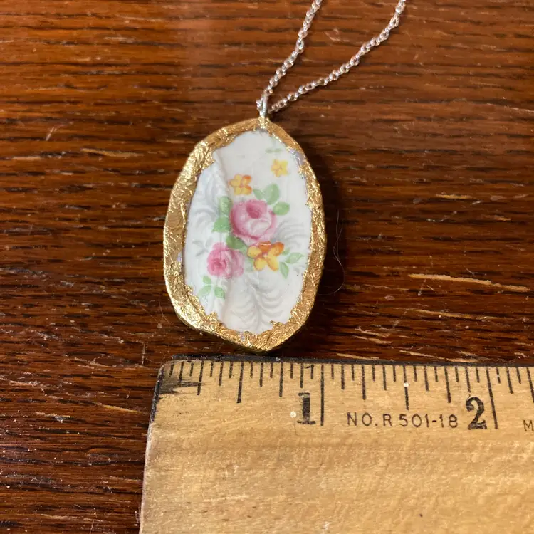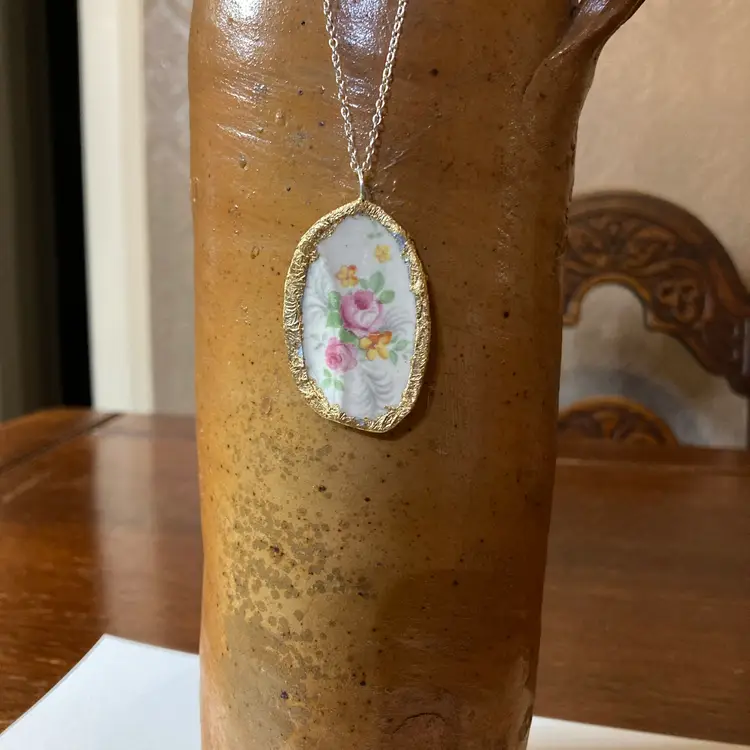 Broken Pottery Artisan Made Pendant Made In USA Plate Handcrafted Necklace 1 in x 1.75 in