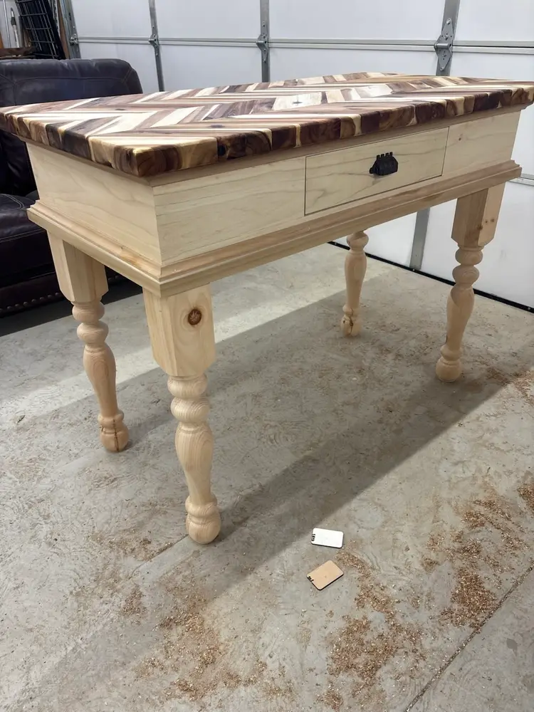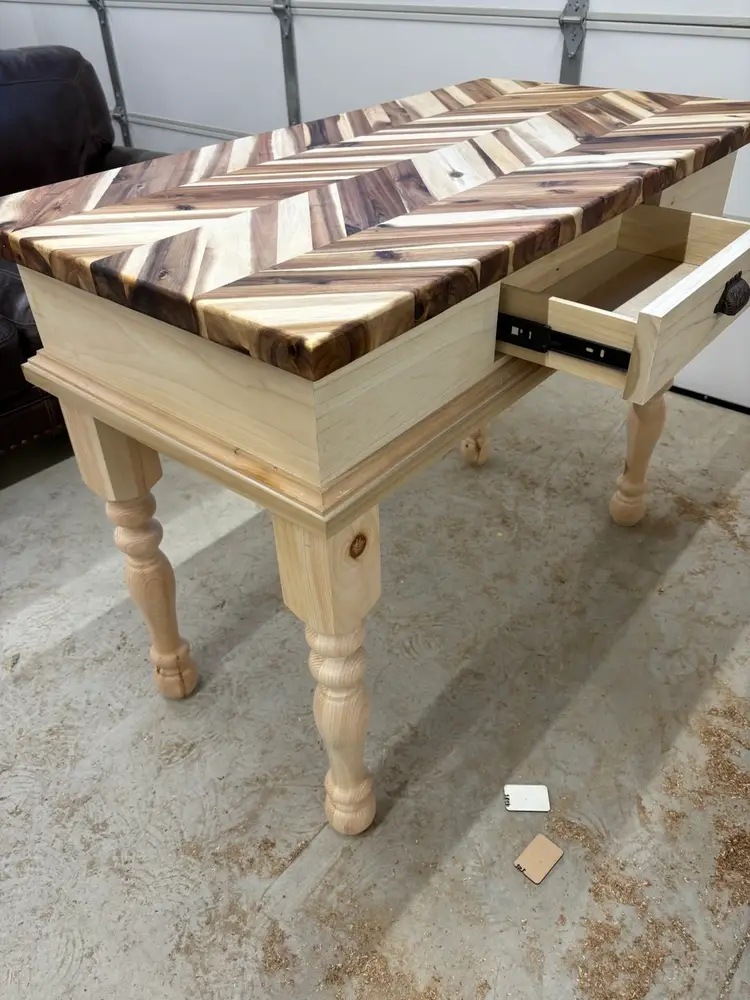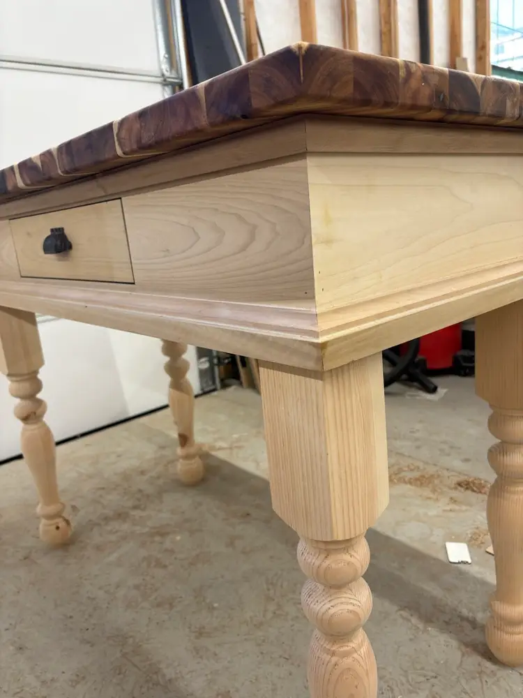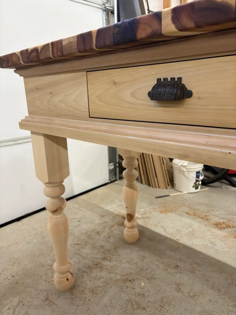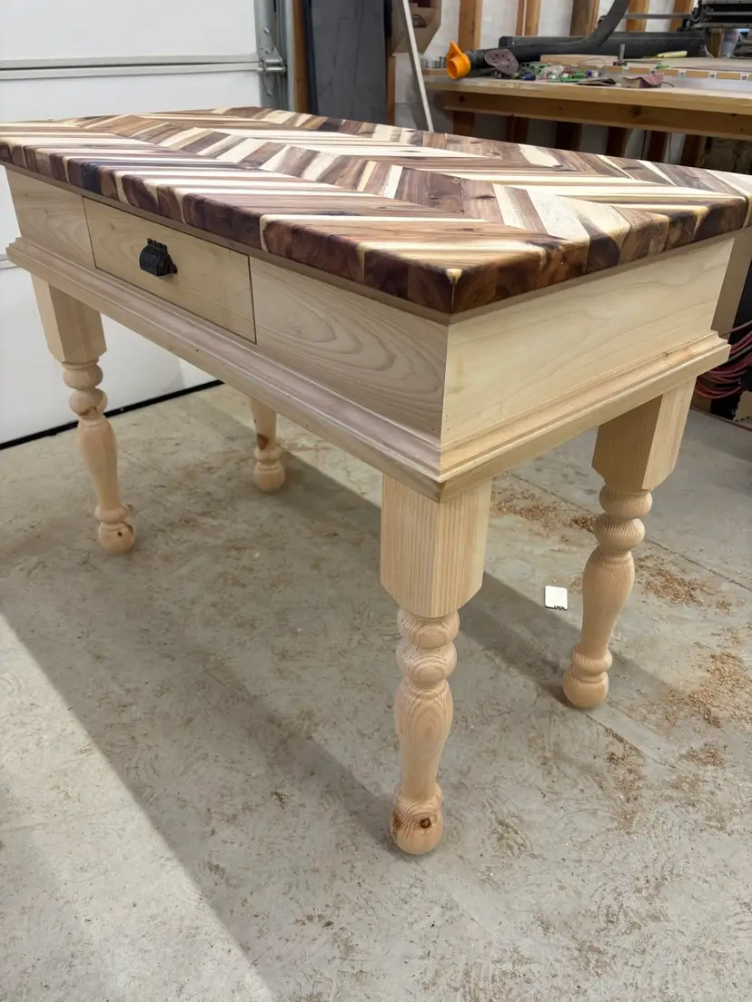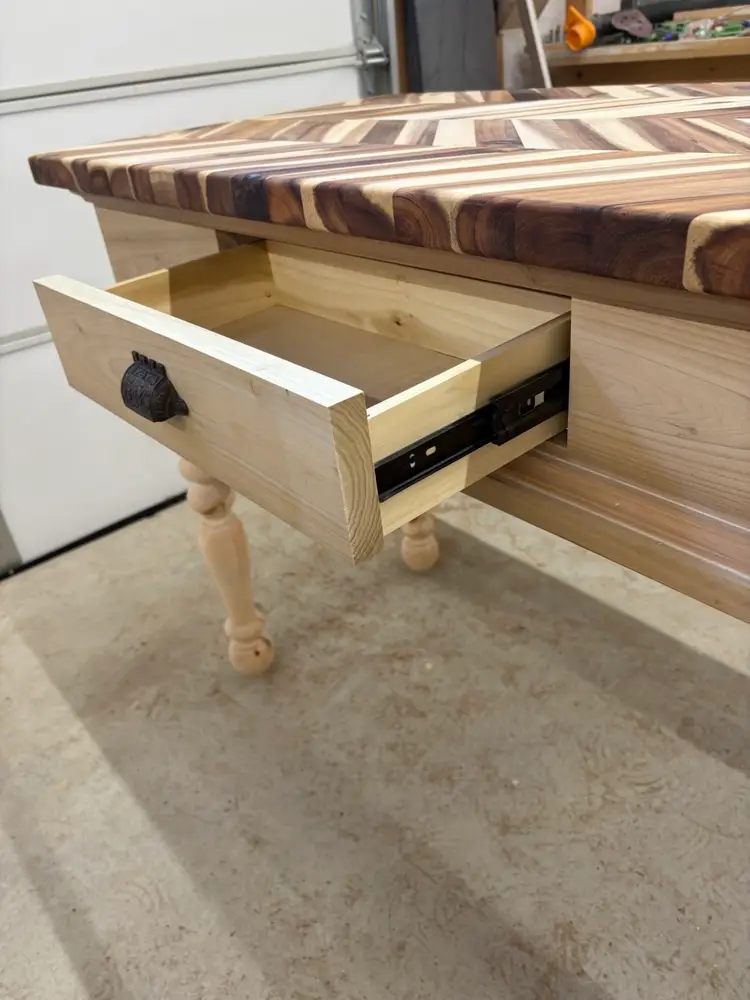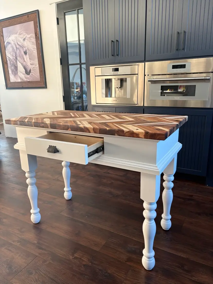 Handcrafted kitchen island. 49” by 25” and 36” high - butcher block kitchen island with 2 drawers, one on each side. Available in custom sizes.