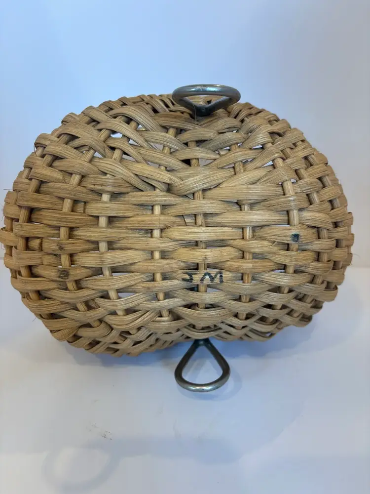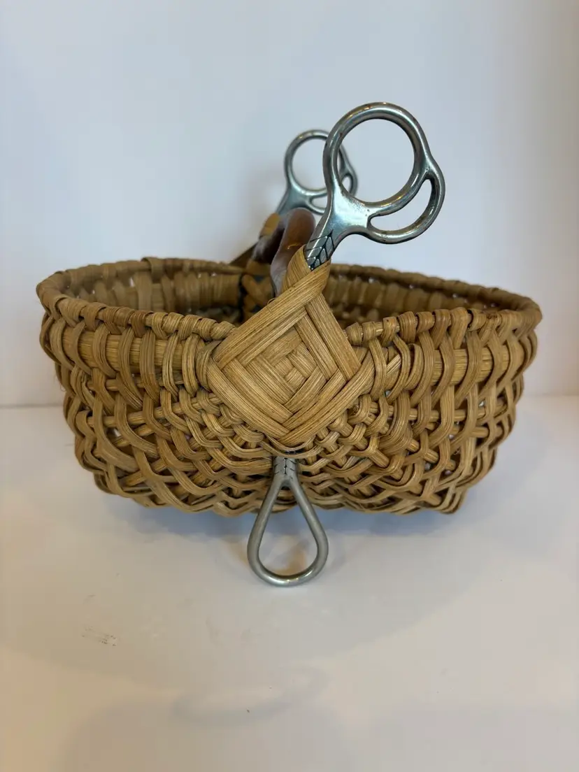 Butt basket that uses a horse bit as the handle in excellent shape. 9 inches long, 5.5 inches wide, 7.5 inches tall.