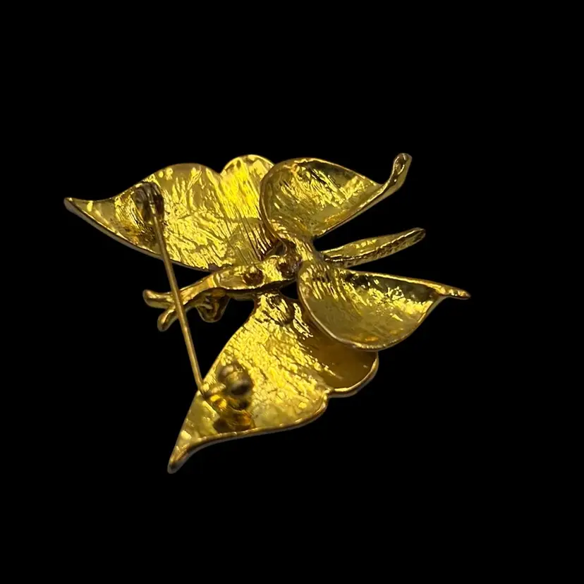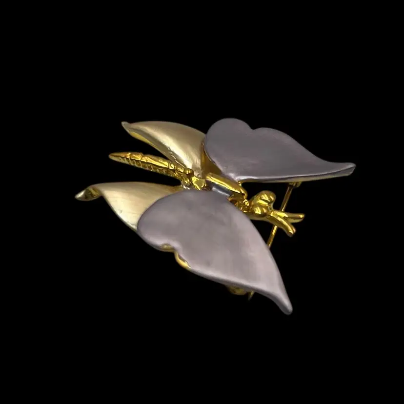 Violet and gold tone setting with chrome type painted wings. No damage.
