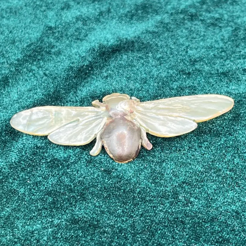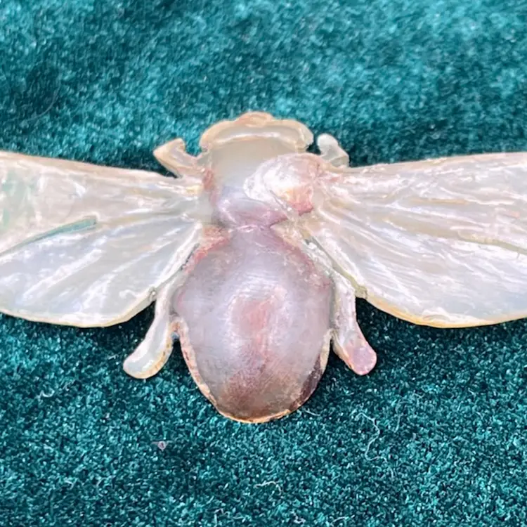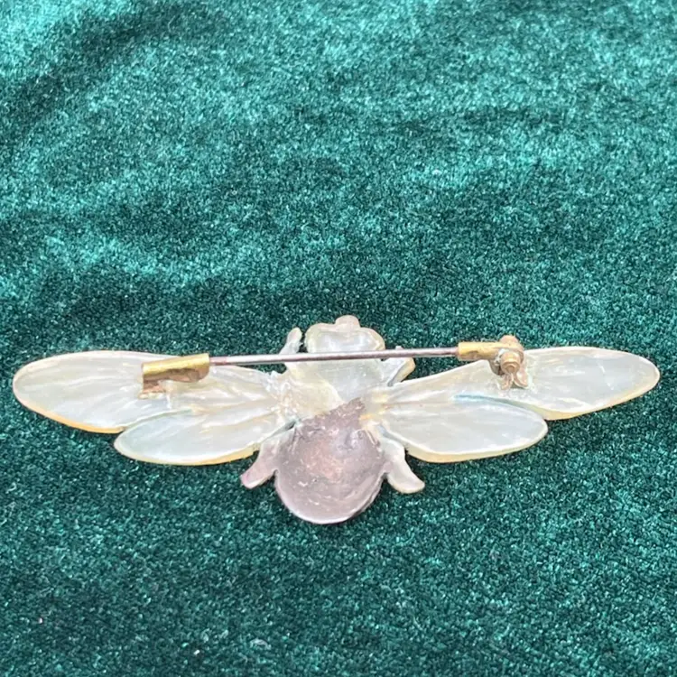 This brooch is not signed. It features a bee created from carved horn. The brooch is fine indeed - the carving of the veins in the bee's wings are nicely detailed. The brooch fastens using a 'C' catch and the pin is attached to the brooch with a tube hinge.