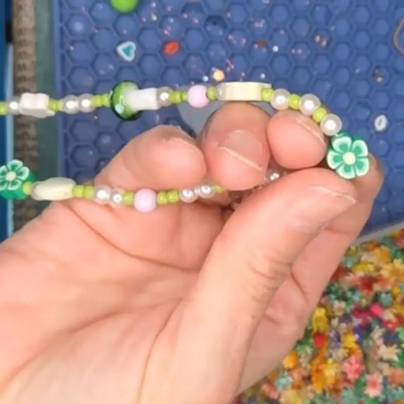 This caulín (girl) is made with a gold seed bead beak, a green bead for her head, a flower bead tailfeather made from a necklace and green and white dried flowers in her body.