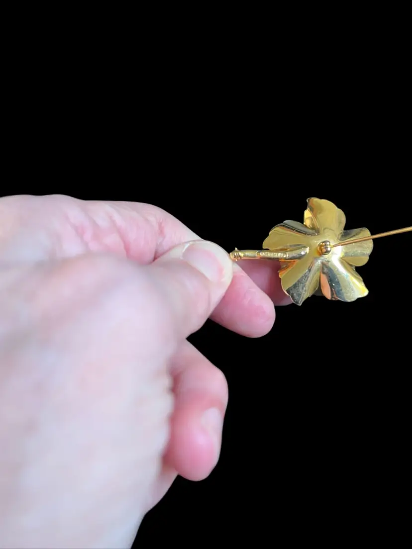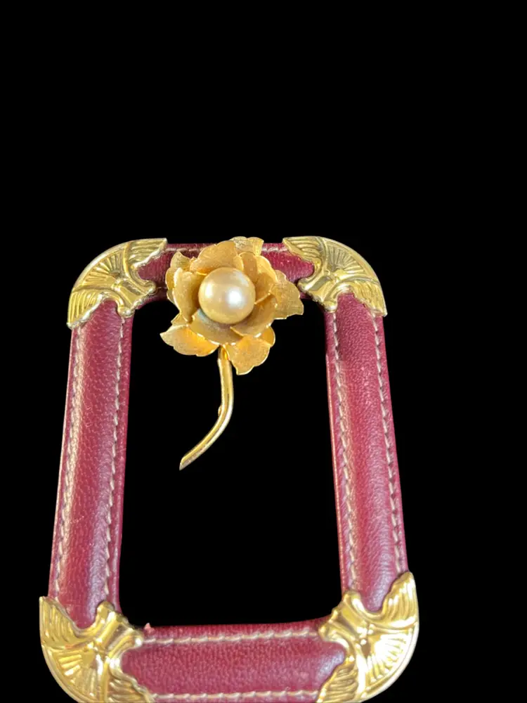 Marked. The gold tone has no patina. The faux pearl has some light wear occurring toward the base of the pearl. The top of the pearl is intact. The clasp is intact and is secure. It measures approx 2.25"L, 1.5" W