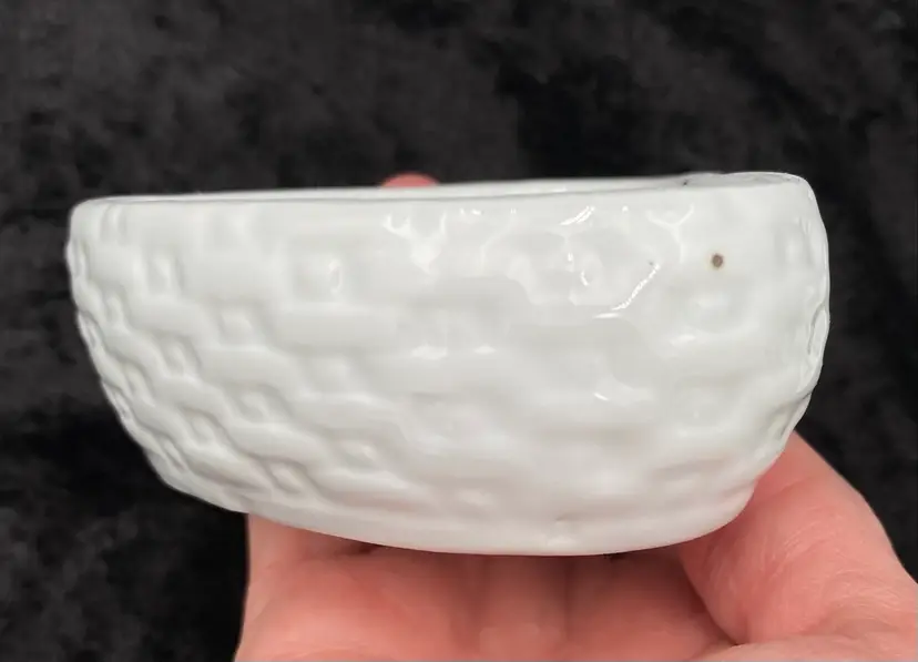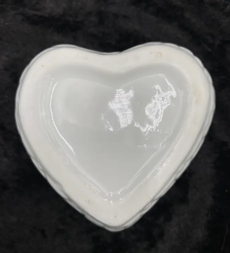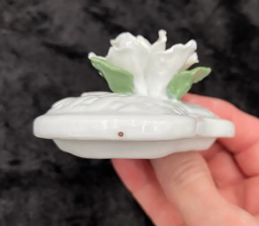 The trinket box is in excellent condition. There are no chips, cracks or signs of wear. There are some dark spots baked into the glaze.