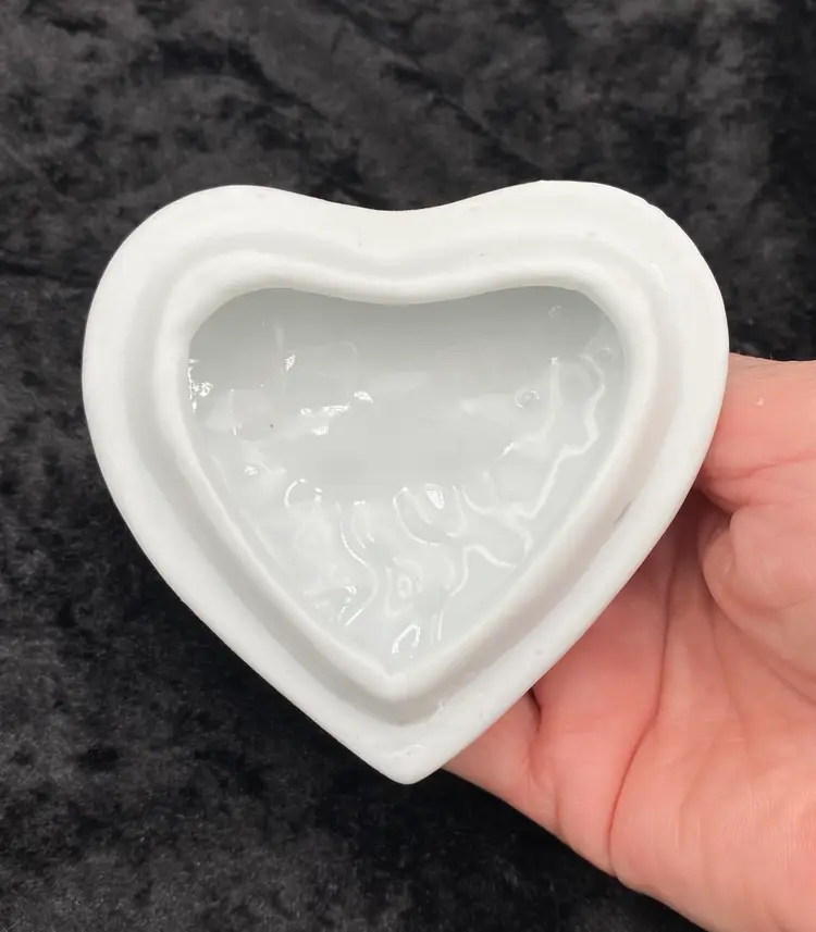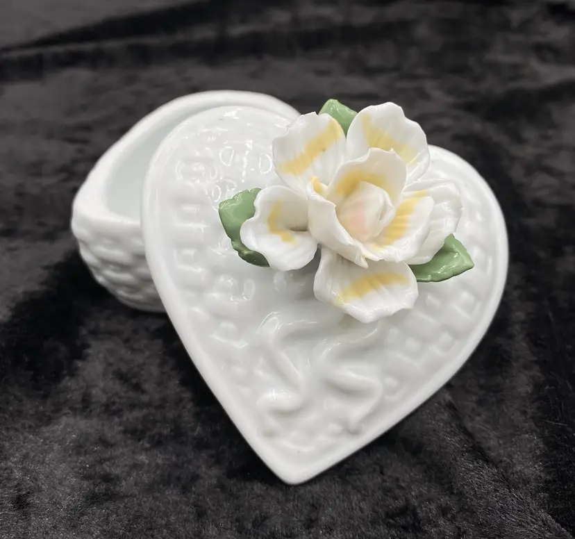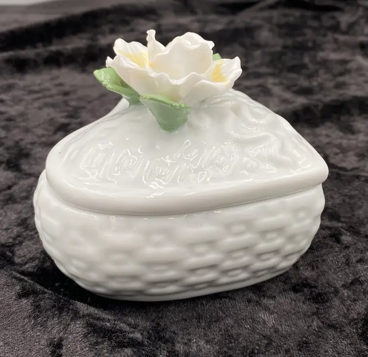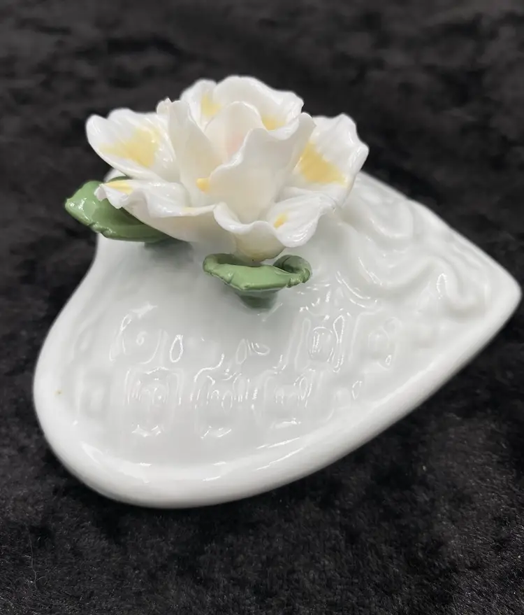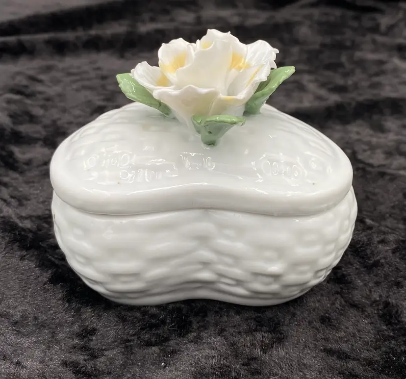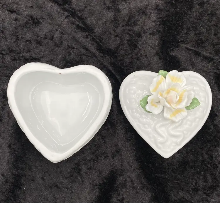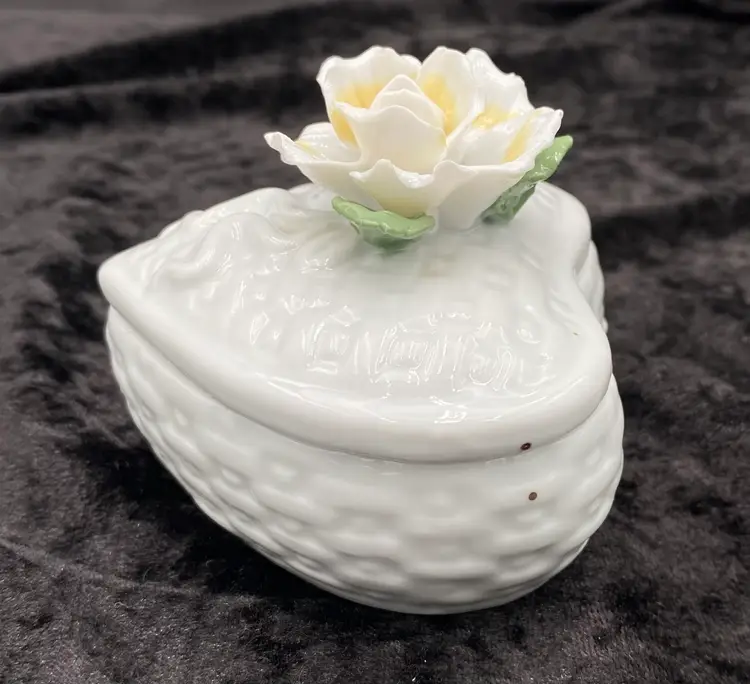 This ceramic trinket box features a heart-shaped design with a basket weave pattern, adorned with an open, ruffled yellow rose and green leaves. The dimensions are 3.25 inches in length, 3 inches in height, and 3.4 inches at its widest point. Made with care and attention to detail, this lovely piece weighs 7.6 ounces. Perfect for storing small treasures or vanity essentials, this trinket box adds a touch of elegance to any space with its beautiful craftsmanship.