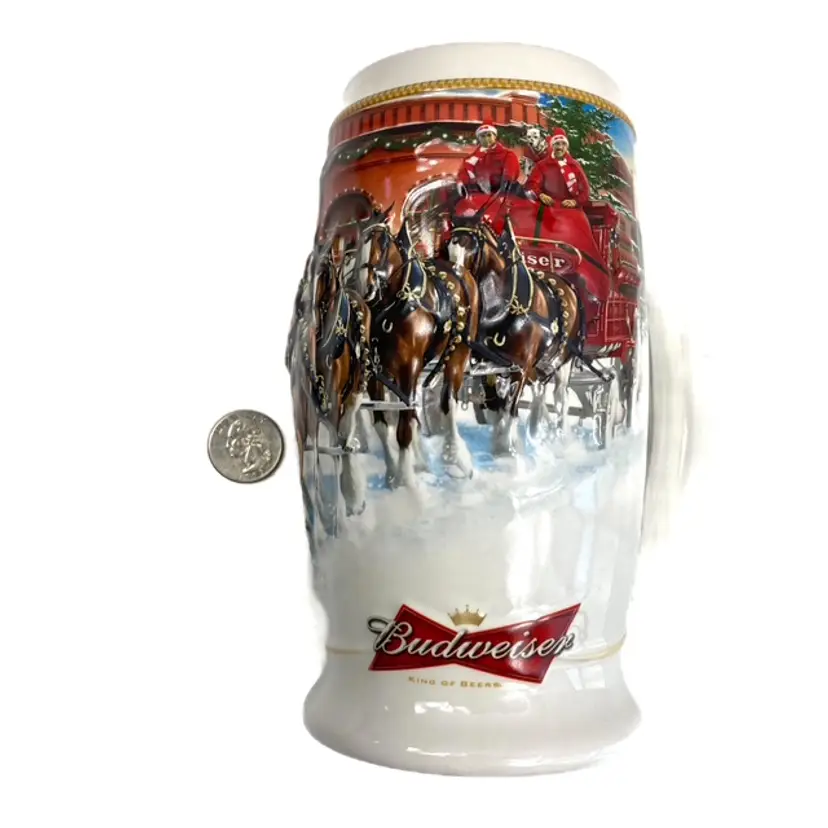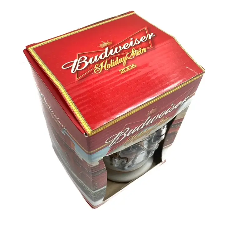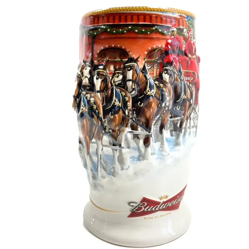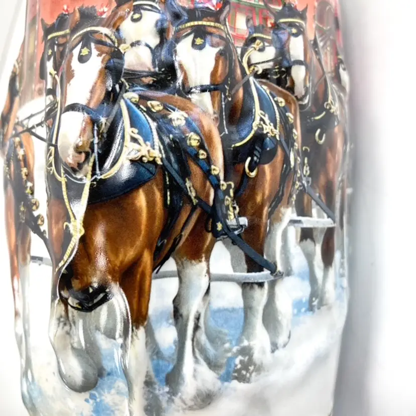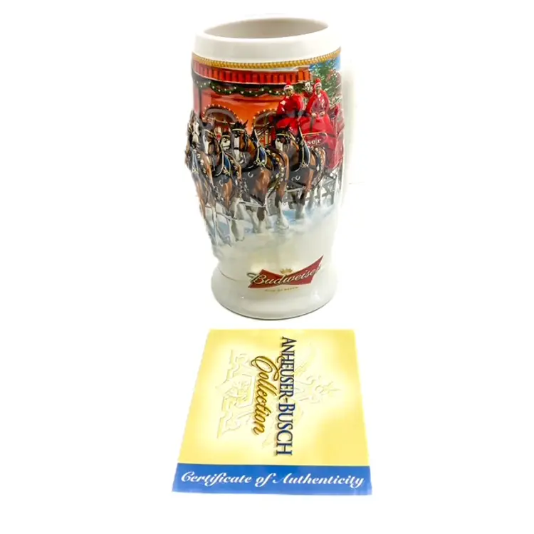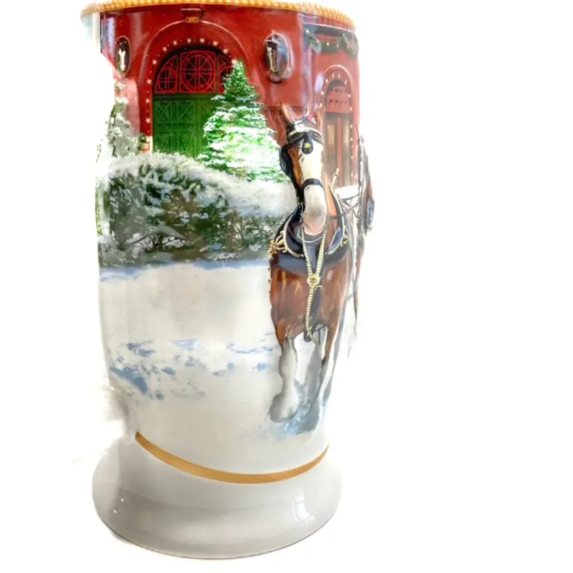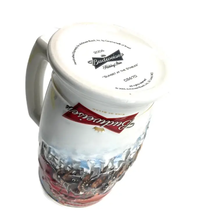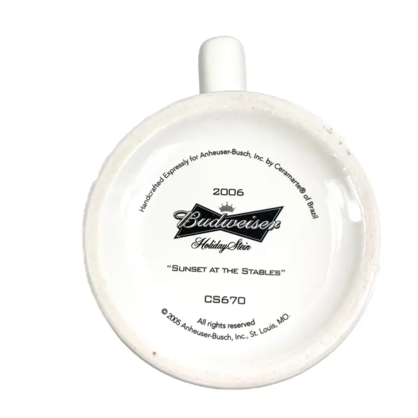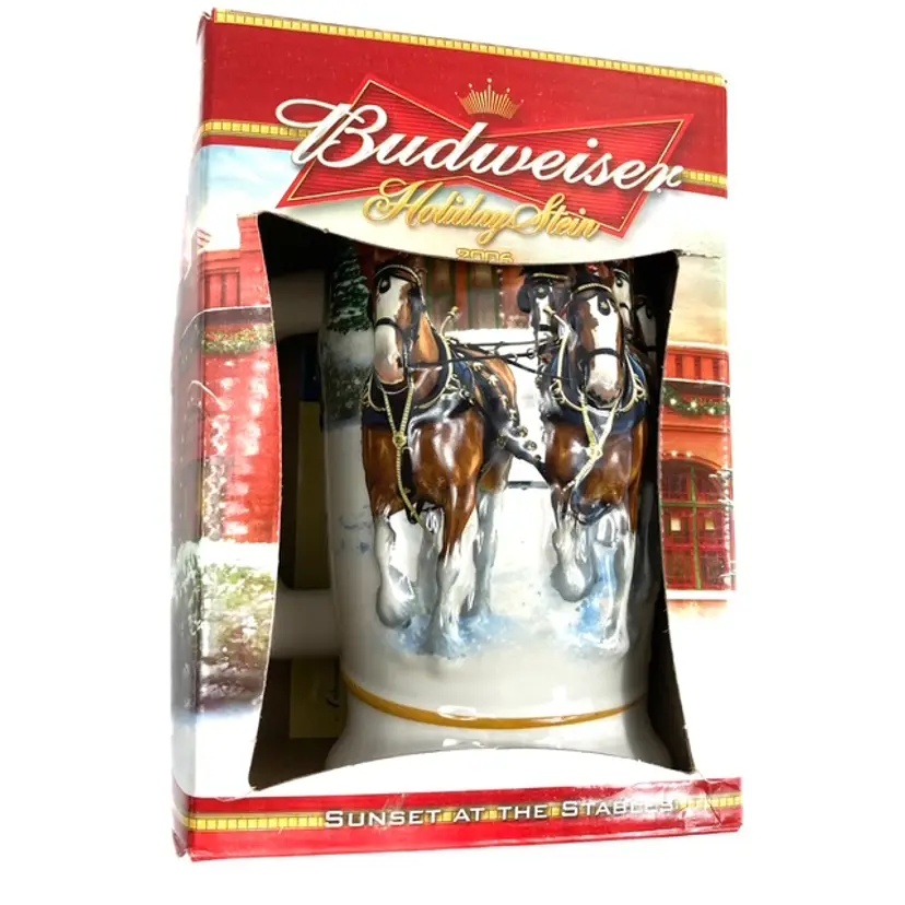 Collectible 2006 Sunset at the Stables Holiday Budweiser Stein. Pre-owned in great condition with certificate of authenticity. Some minor expected wear on box edges- see photos. Illustrated by Jeff Wack. mar1561