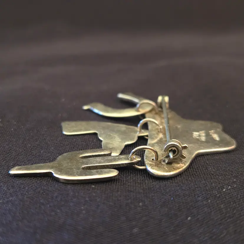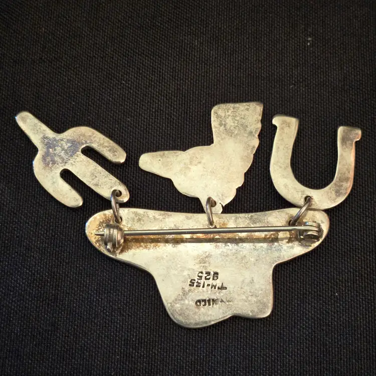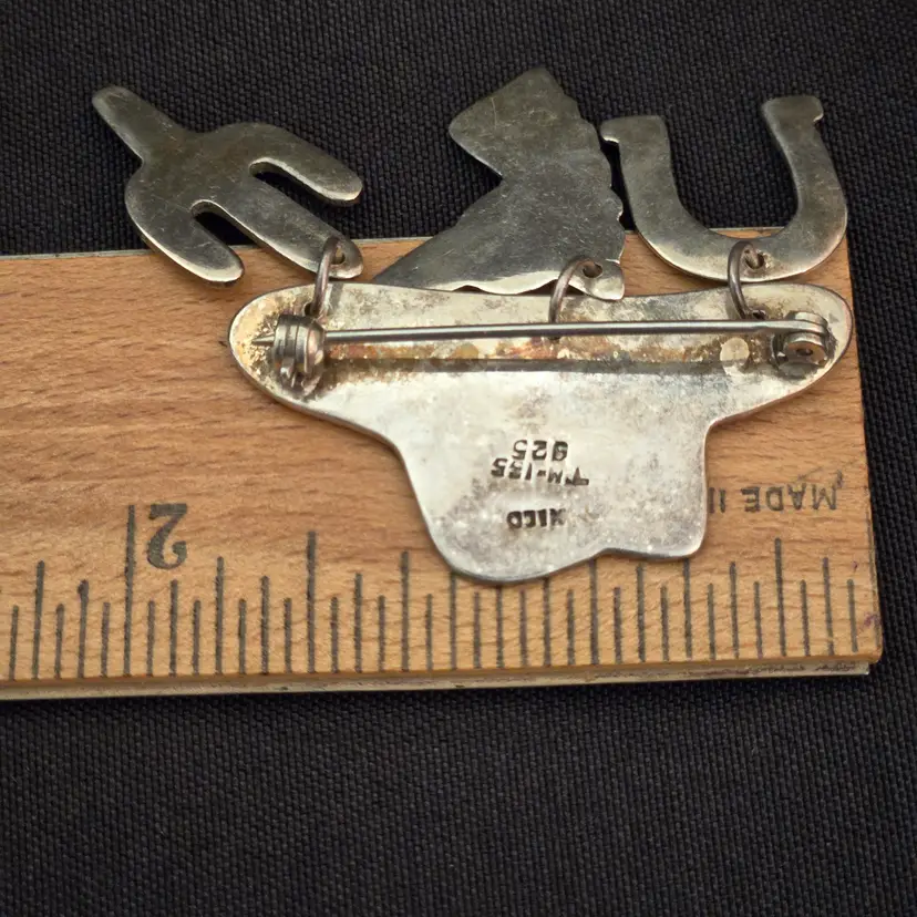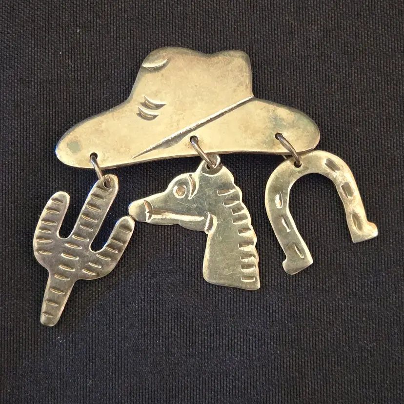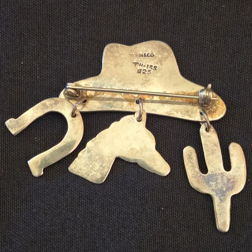 Cowboy Hat with Dangles Horse Cactus Horseshoe Brooch Charm Pin Stamped Mexico TM-135 925 Silver Vintage with Condition Issues. Used condition with general signs of wear including tarnish, dirt, scratches, nicks, etc. from actual use. Please view all the photos and please ask any questions prior to purchase when possible.