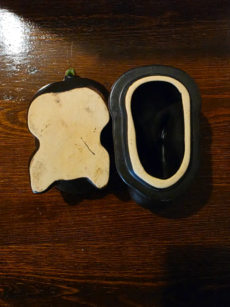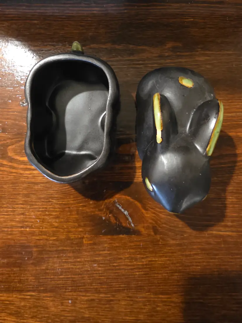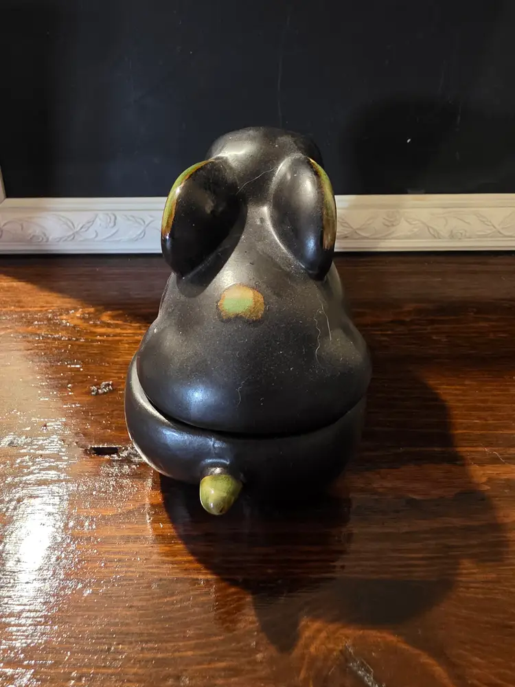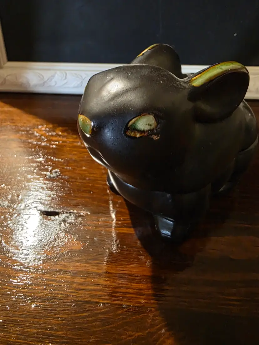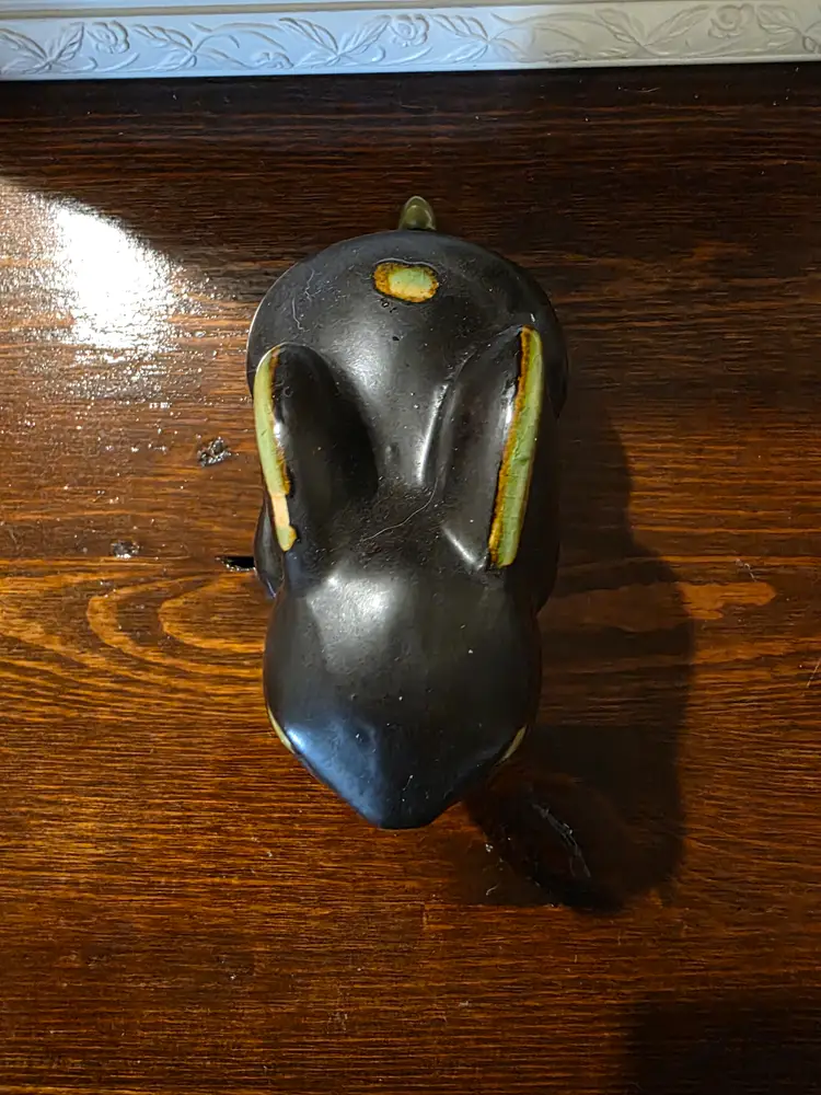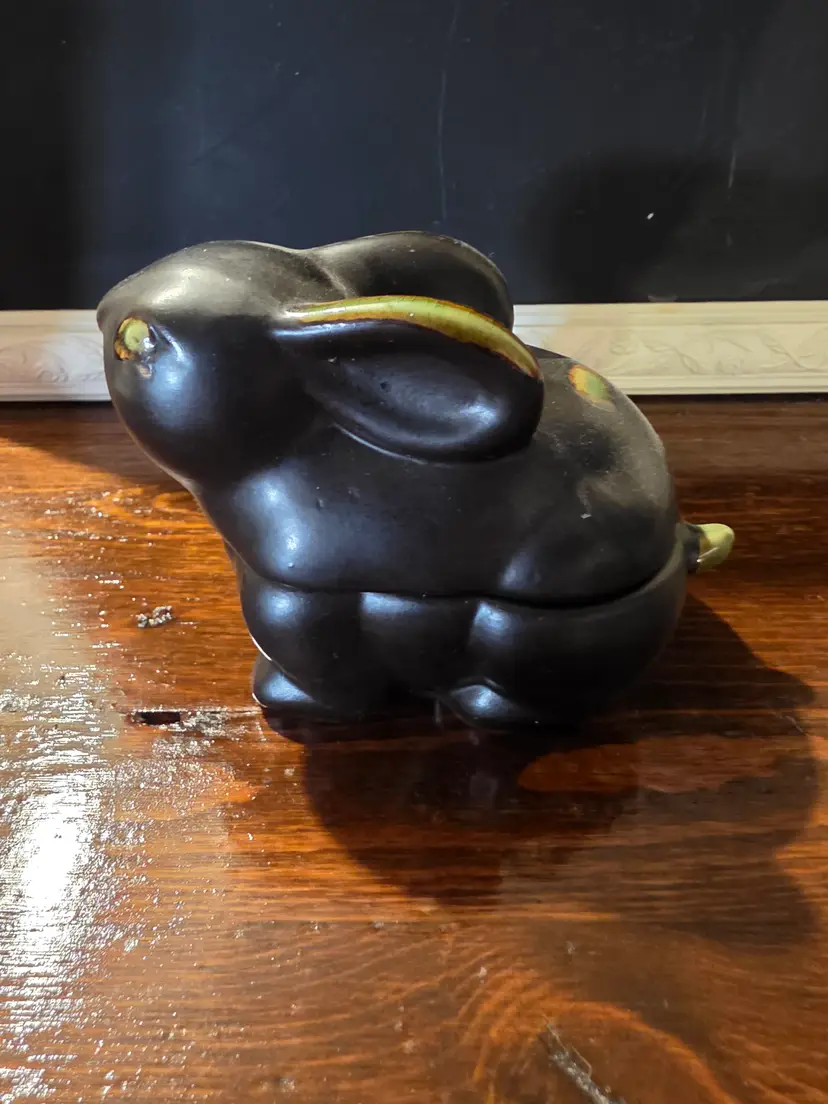 Very cute brown pottery bunny with yellow highlights trinket dish. Bunny is brown in color with yellow highlights on eyes, ears and tail. Piece is used but in excellent condition with no chips or cracks. Piece is approximately 4 inches height and 5 inches length with a 3 inch width. Very collective piece perfect for animal lover's.