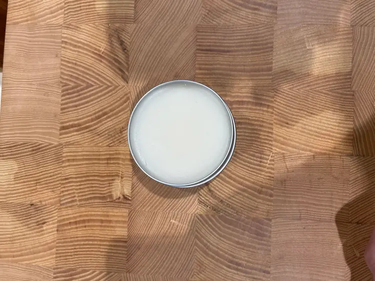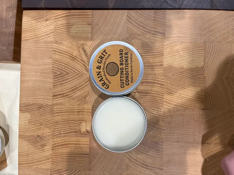 Cutting board conditioner is made for food grade beeswax and mineral oil.