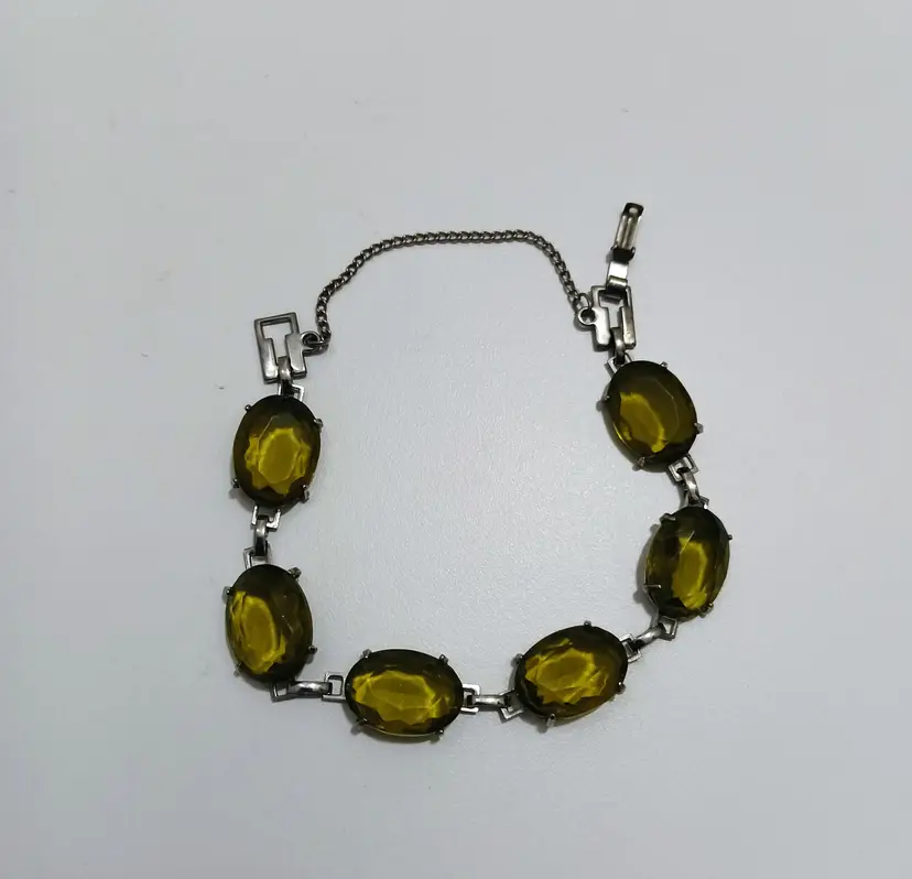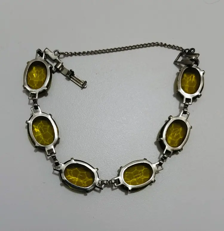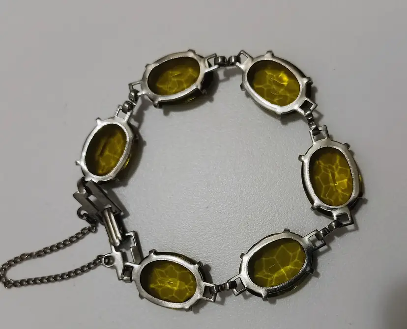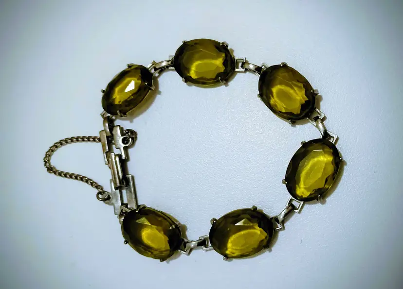 Vintage Green Czech Glass Silver Tone Bracelet w/Safety Chain Clasp; Small Wrist Size; Very Nice Condition; No Chips or Cracks or Foxing on the Metal