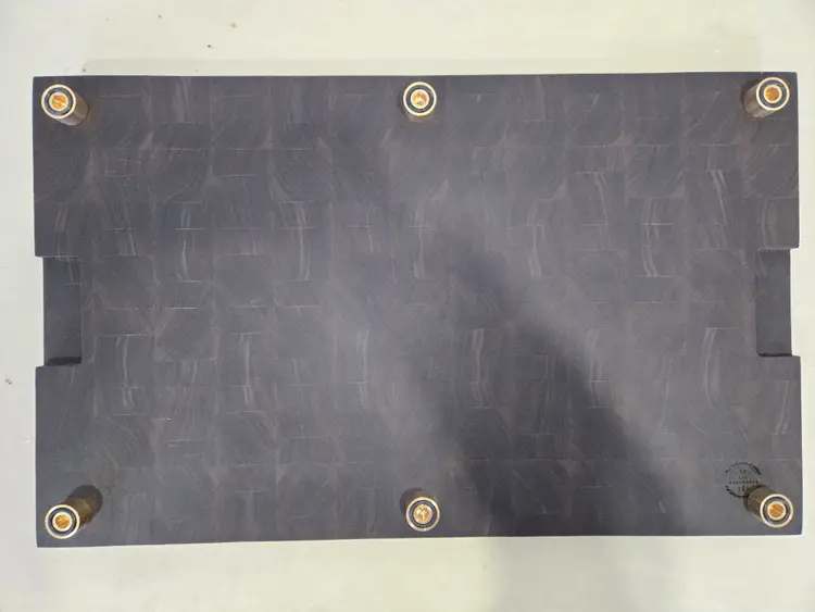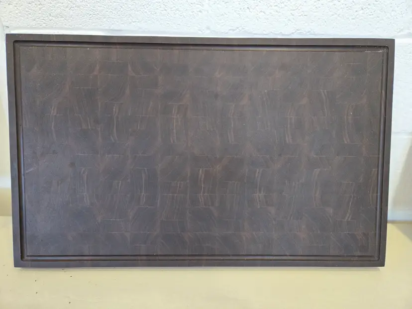 Sophisticated dark walnut end grain brisket board perfect for large cookouts or any kitchen. Free Shipping. Includes brace feet and juice groove. 18"x28". Custom orders welcome. Special engraving available upon request with additional fee.