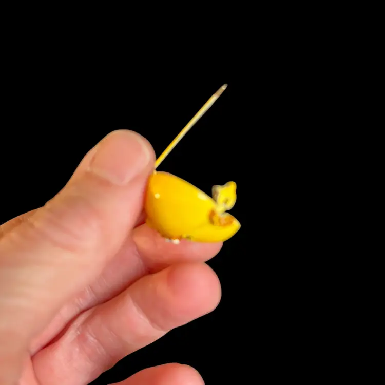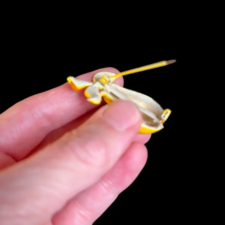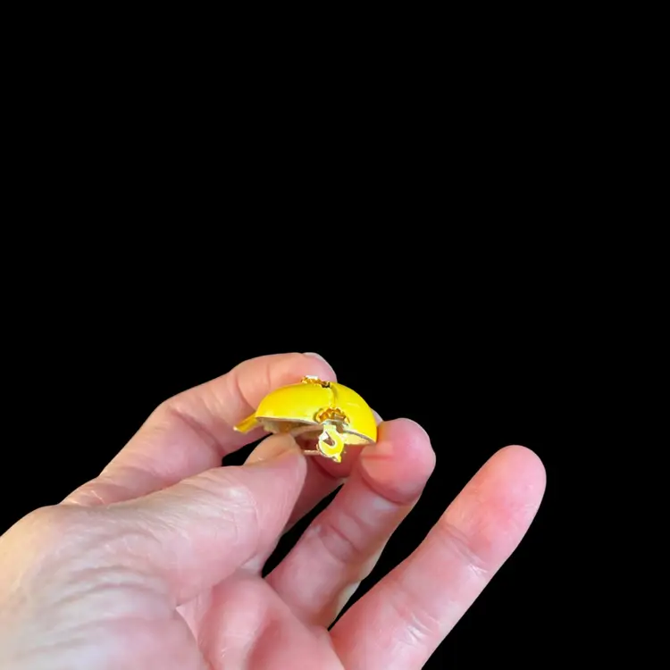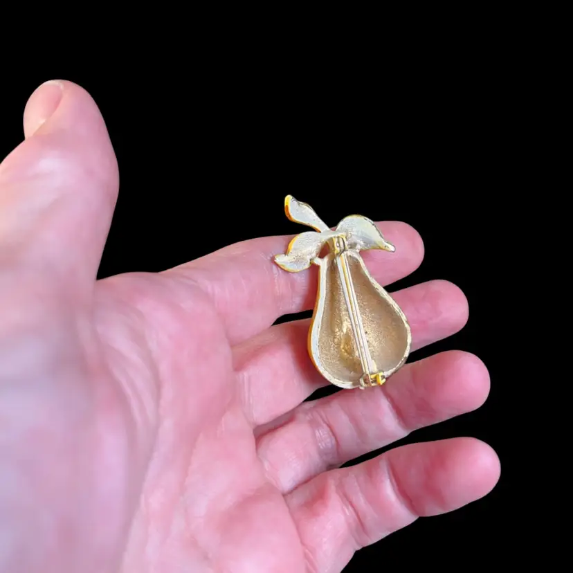 This unmarked. But. Just as quirky and cute as can be. There are no call outs. It is in great condition. Clasp is intact and secure. Measures approx 1.75" L, 1"W.