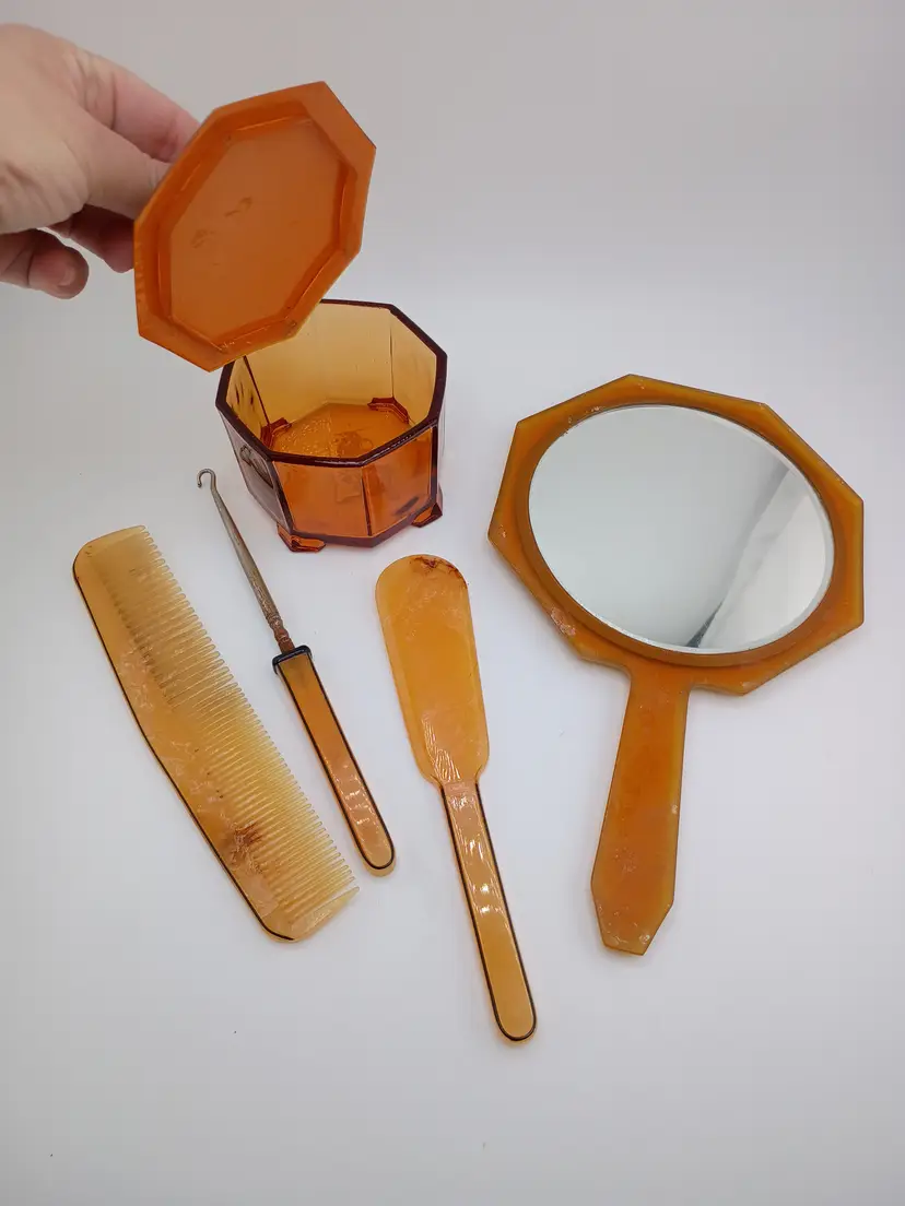 This is a wonderful vintage vanity set by Dupont in celluloid. It includes a hand mirror, lidded box, comb, shoe horn, and button hook. It's in very good vintage condition with no chips or cracks and some wear to the deoration on the back of the mirror.
