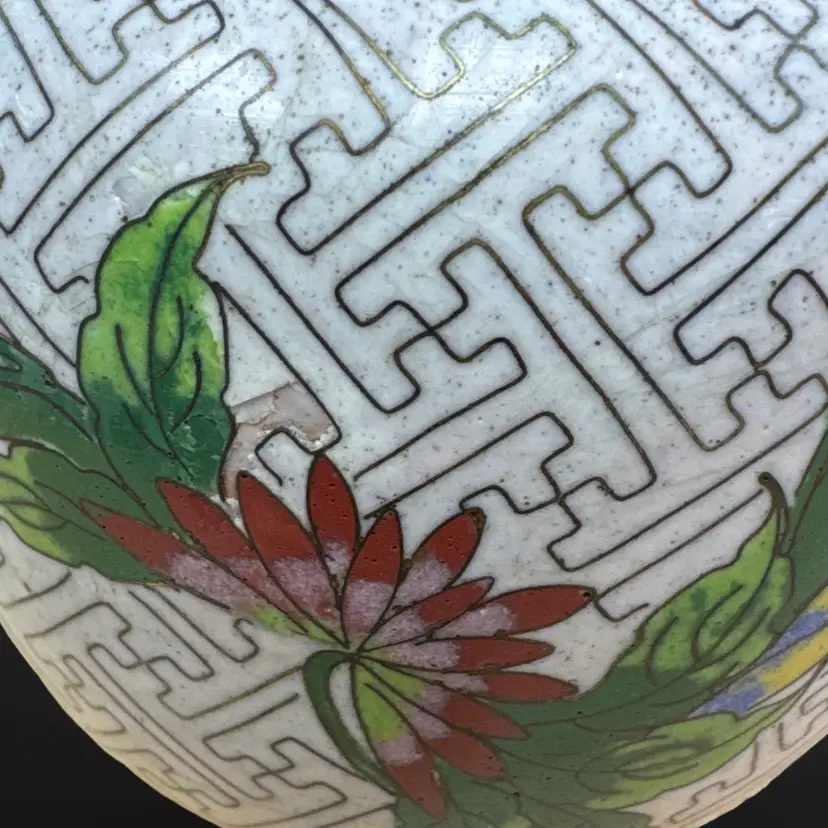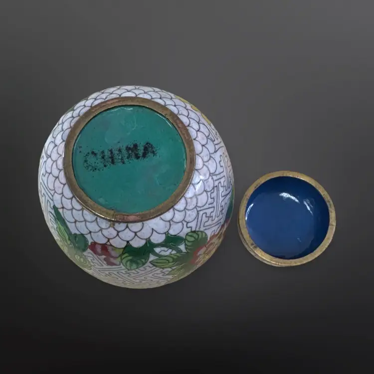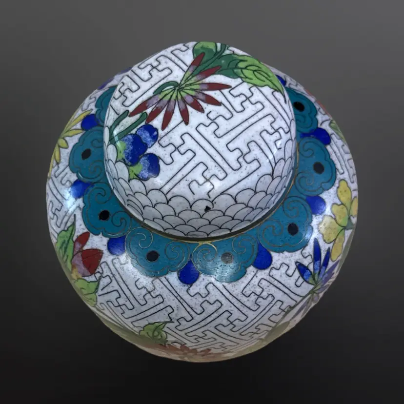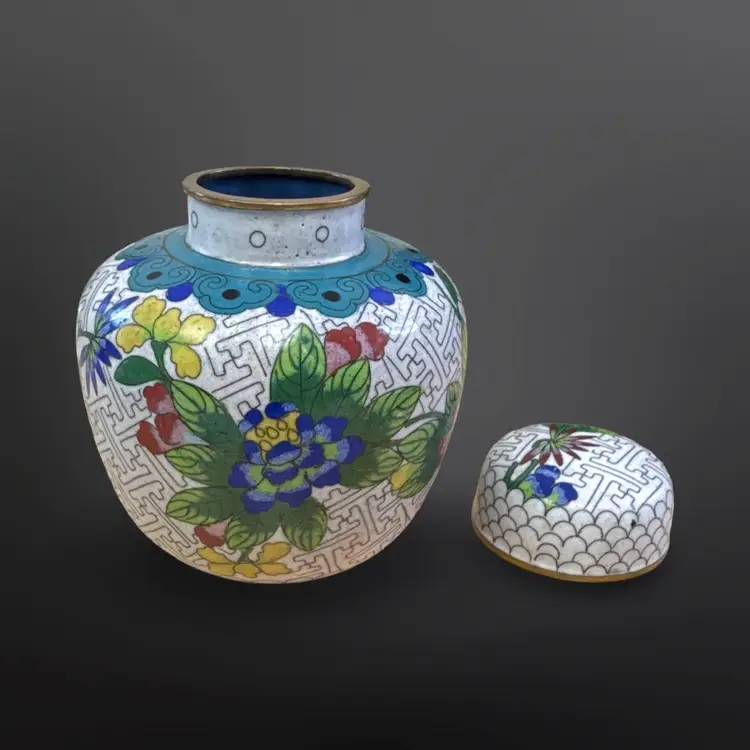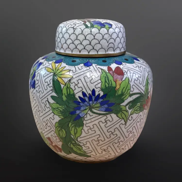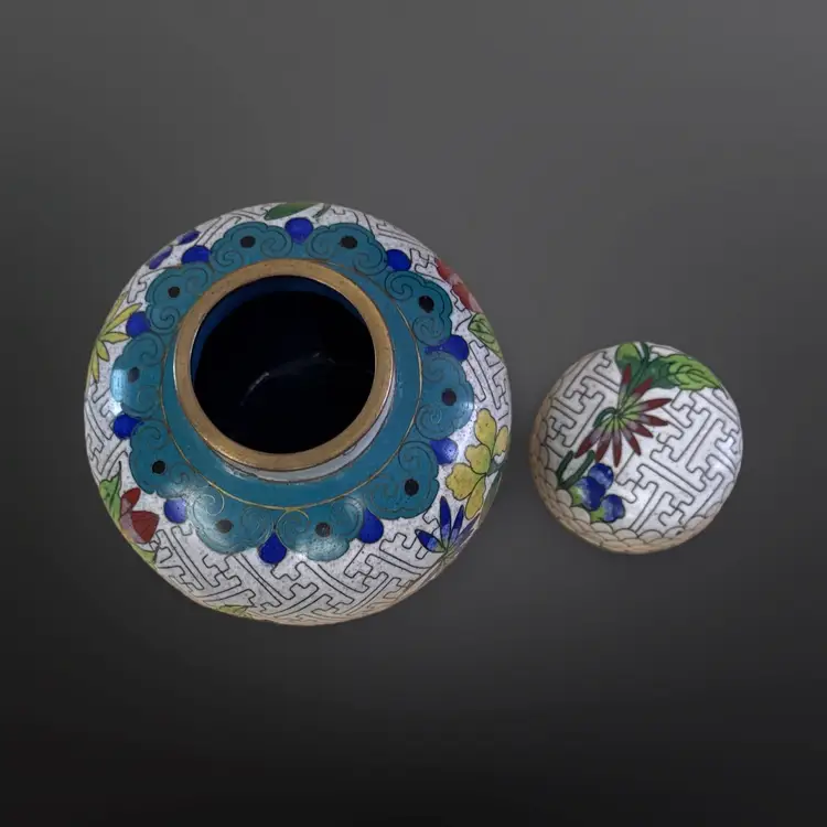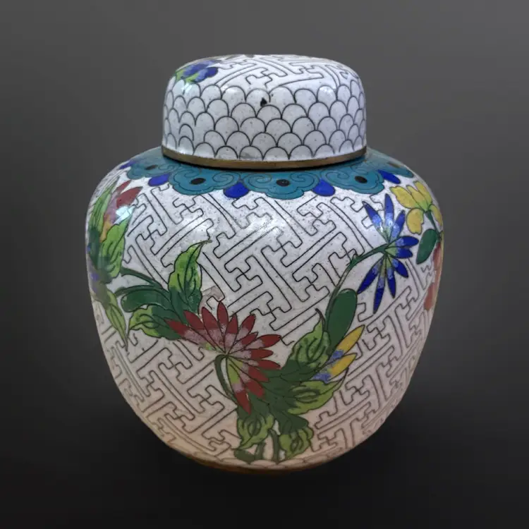 Beautiful vintage cloisonné ginger jar; keyhole pattern on white enamel with colorful floral design. In good vintage condition with just one chipped area on the enamel (see photos). Measures approximately 3.5” W x 4.25” H