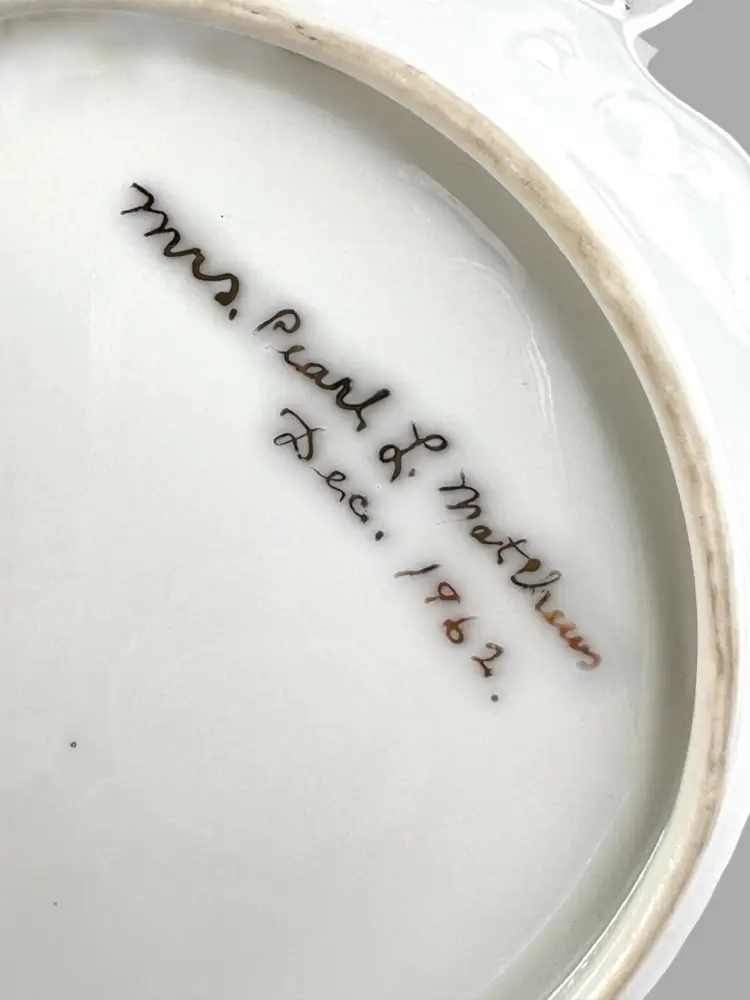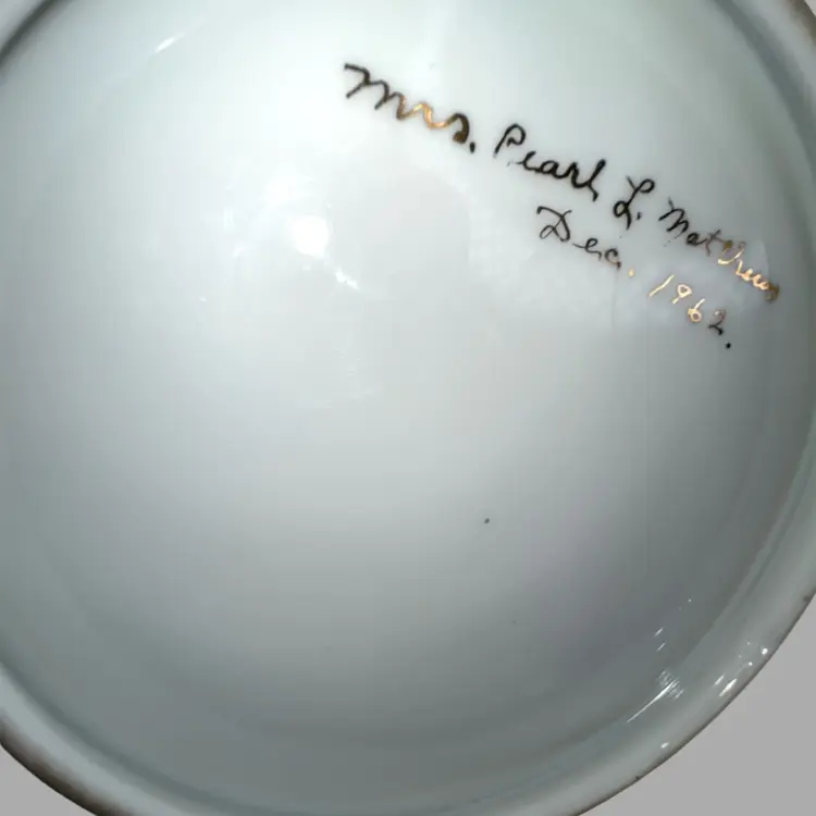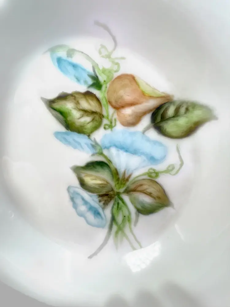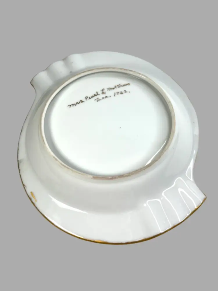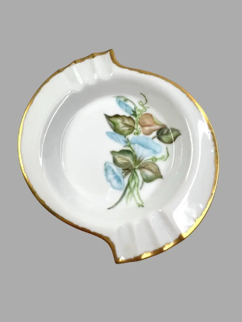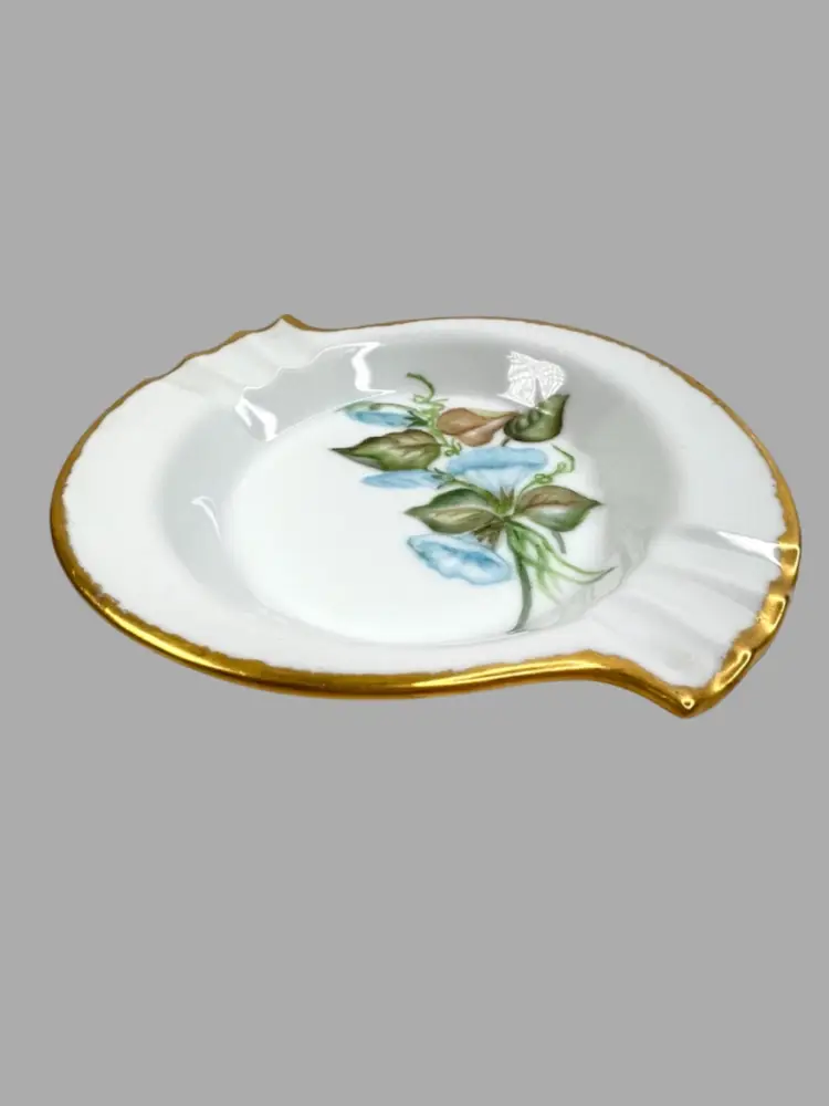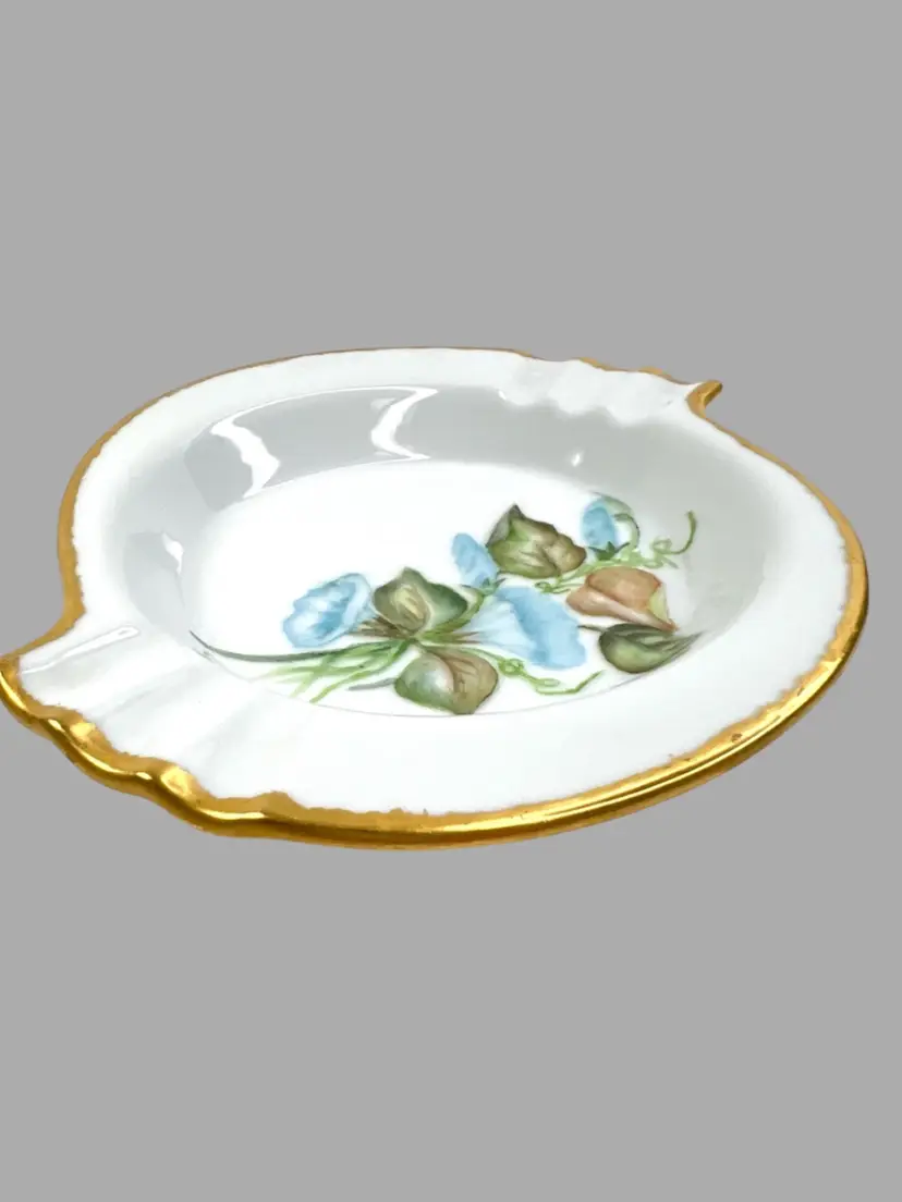 Elegant S-shaped Bone China Ashtray. Hand-Painted Blue Morning Glory Florals. Artist Signed on Bottom “Mrs. Pearl L. Matthews Dec. 1962.” 22-24K (tested) Gold Trim on Rim. 6-1/2” L x 5-3/4” W x 1” H Weighs 8 ounces Condition: No chips, no cracks, no crazing