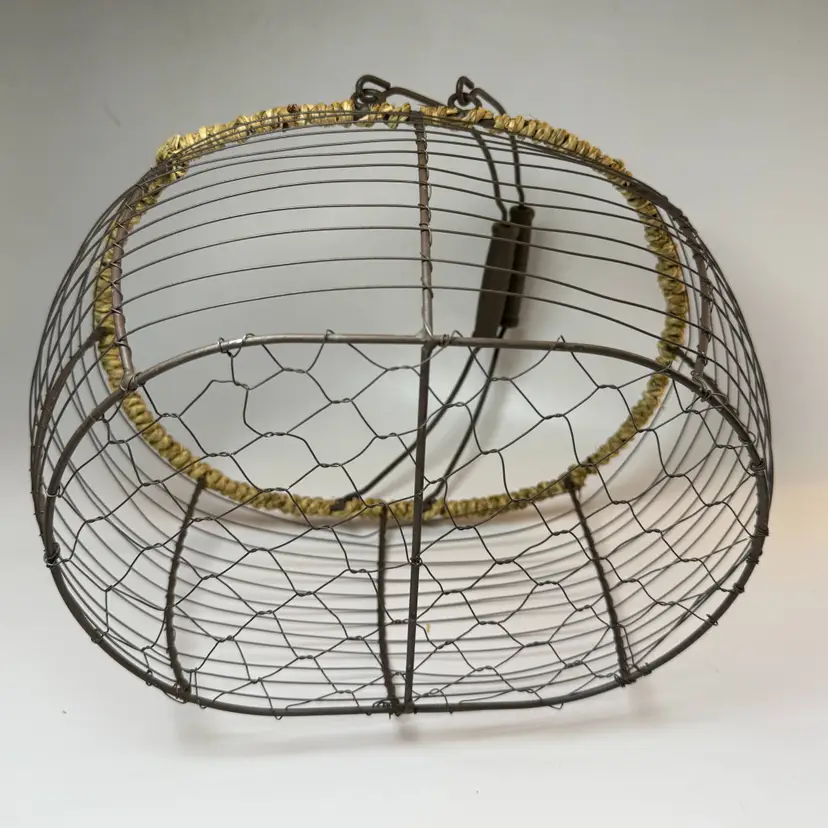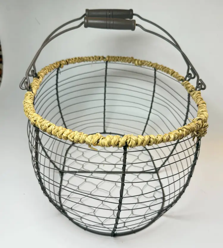 Farmhouse Chicken Wire Egg Basket Gathering with Handles Cottagecore Country Big Cottage. About 12" tall including handles x 12" across x 9.5" wide. Handles fold down. Great condition. No issues.