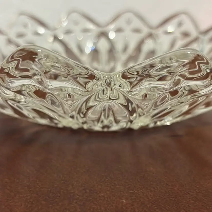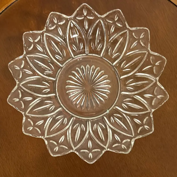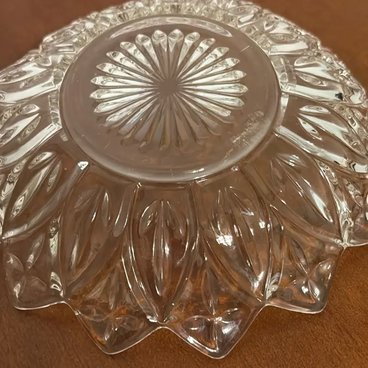 This is a vintage Federal Glass Petal Pattern bowl. Key features include: Pattern: Features a distinctive petal or flower shape with a pressed glass pattern. Era: Produced by the Federal Glass Company, likely in the 1960s. Material: Made from heavy, thick, clear pressed glass. Function: Useful as a serving bowl, salad bowl, or decorative dish.