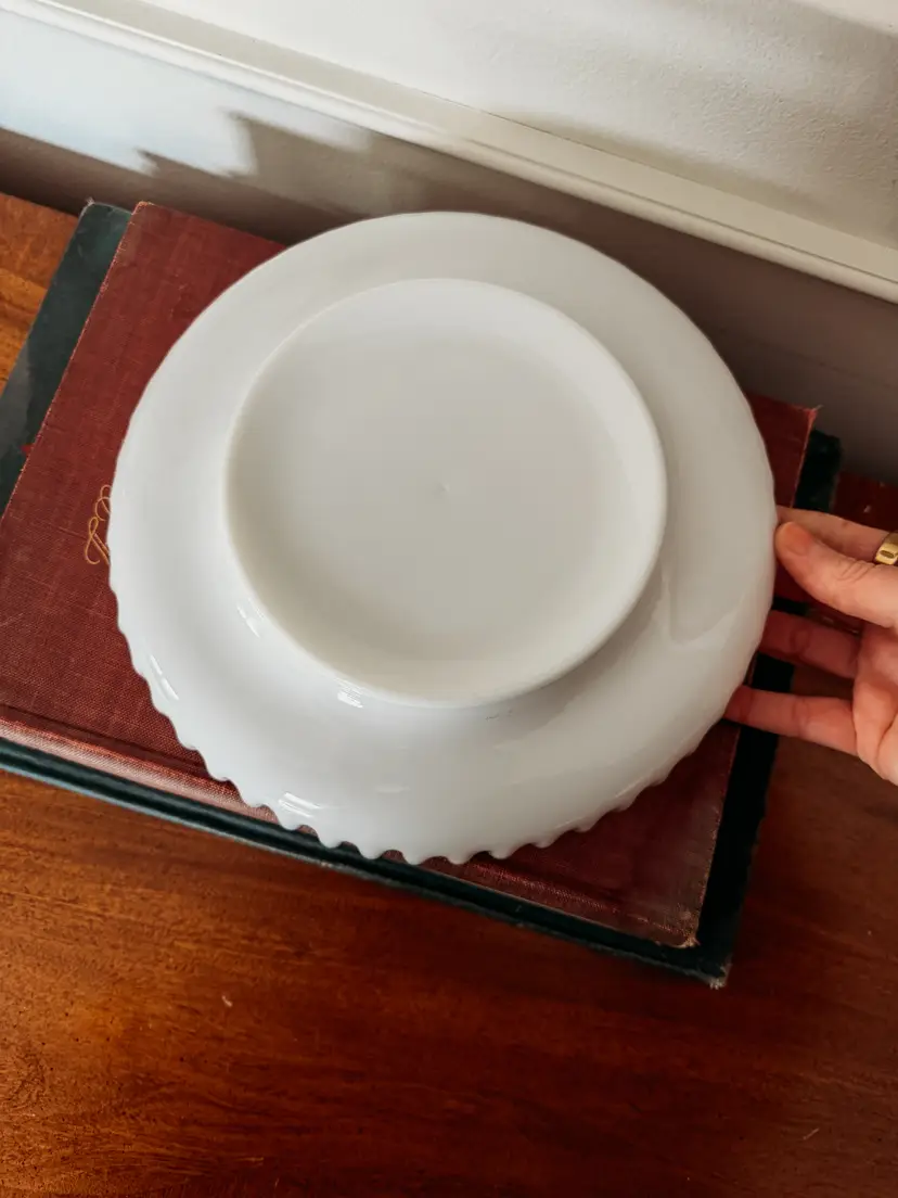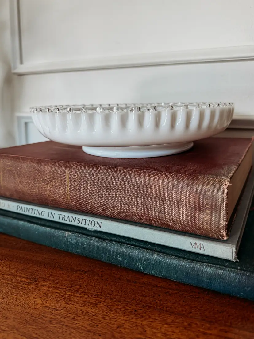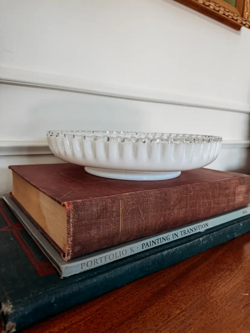 The is a vintage Fenton Silver Crest milk glass crimped-edge bowl or candy dish. It is made of opaque white milk glass with a distinct clear, ruffled or crimped edge. Fenton Art Glass Company produced items in the Silver Crest line from the 1950's to 1970's