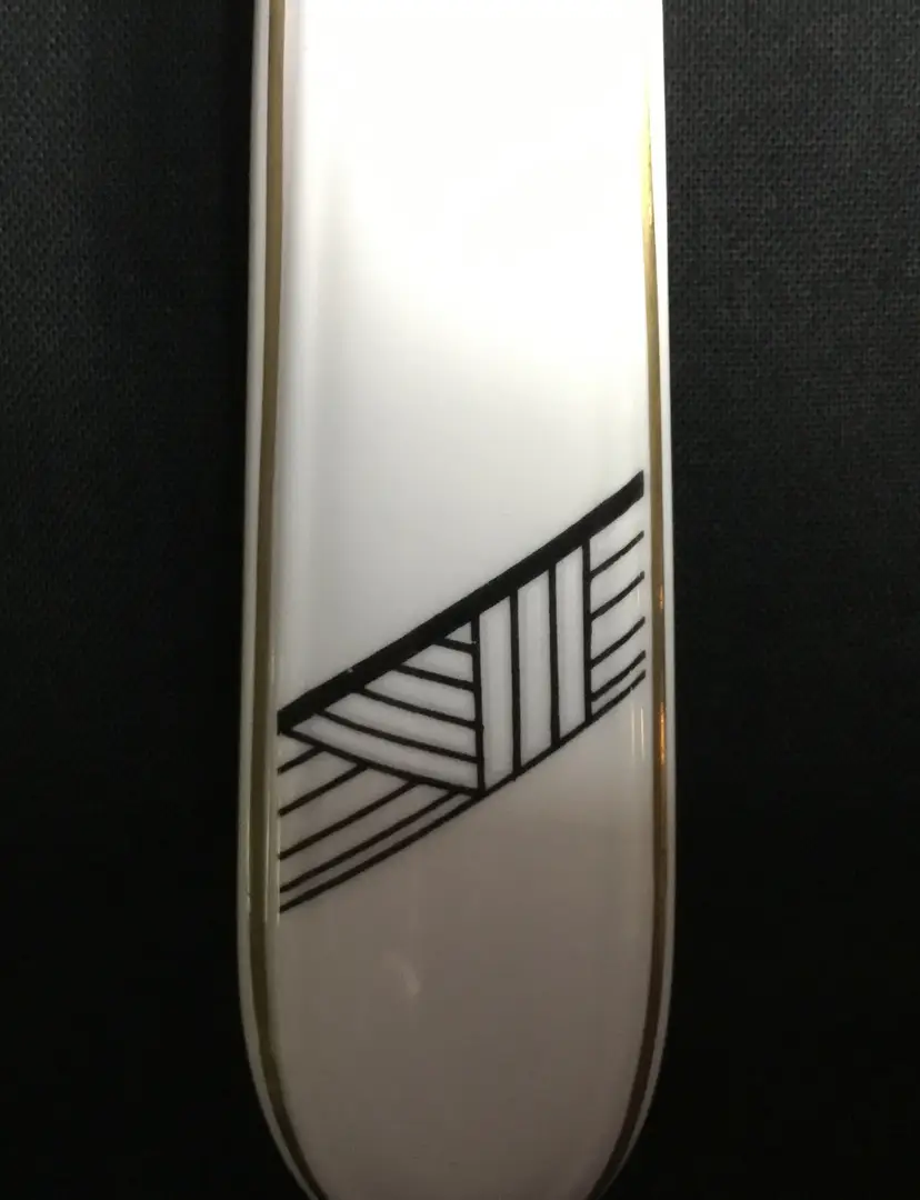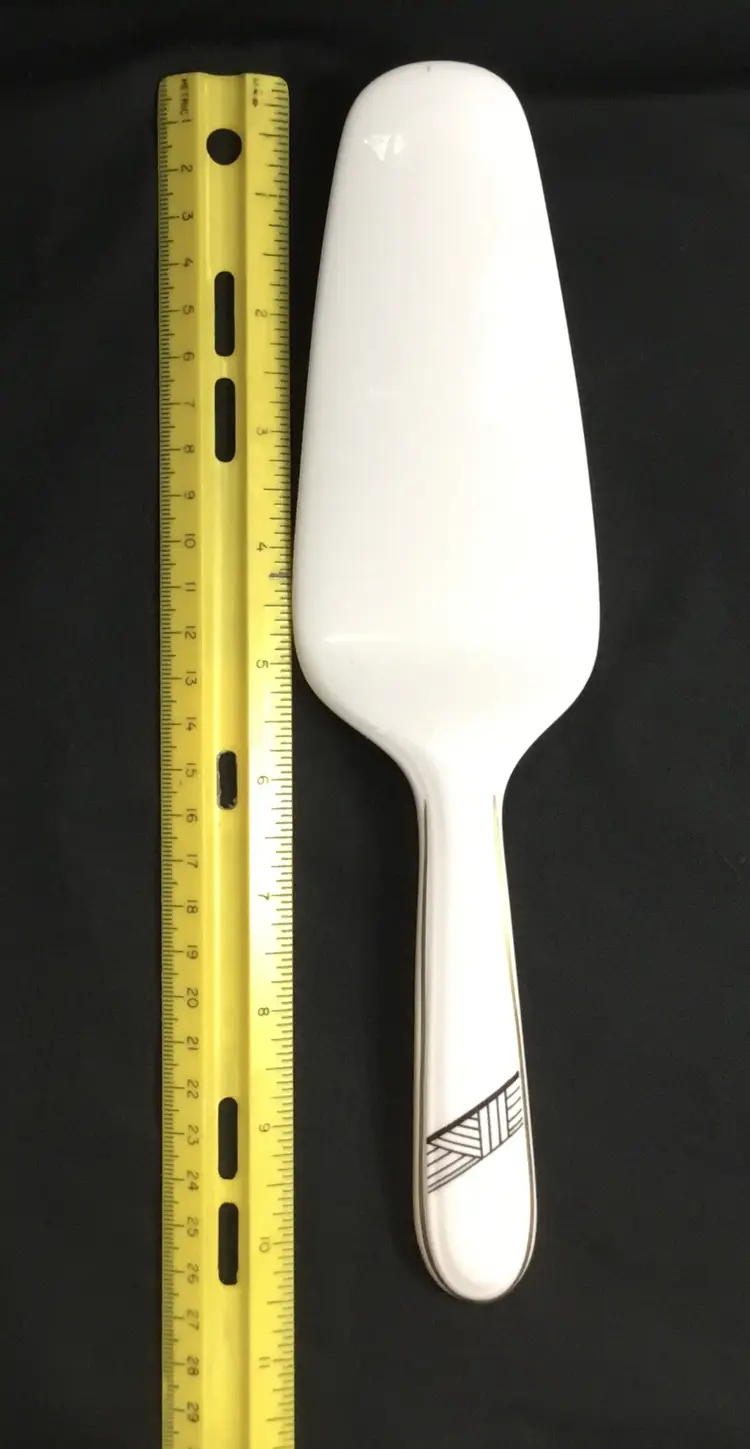10.5 inches in length, white bone china with gold line detail around handle and black Art Deco detail across handle.