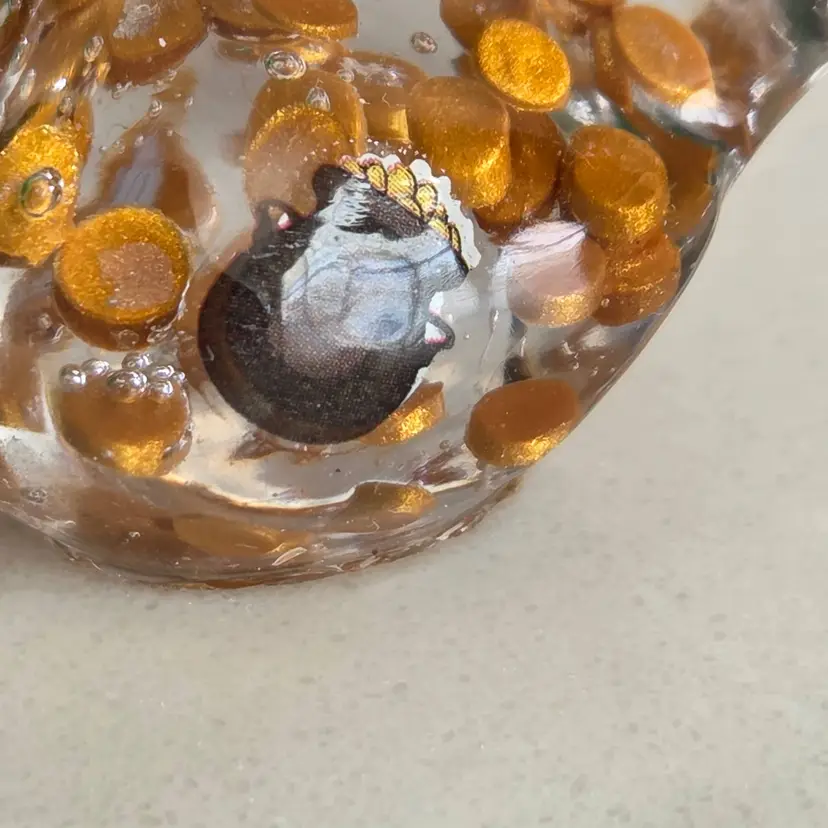 These tiny little birds are handmade from UV resin and bits of baubles and bling from my craft jewelry pile or whatever else I can throw in. No two are alike.