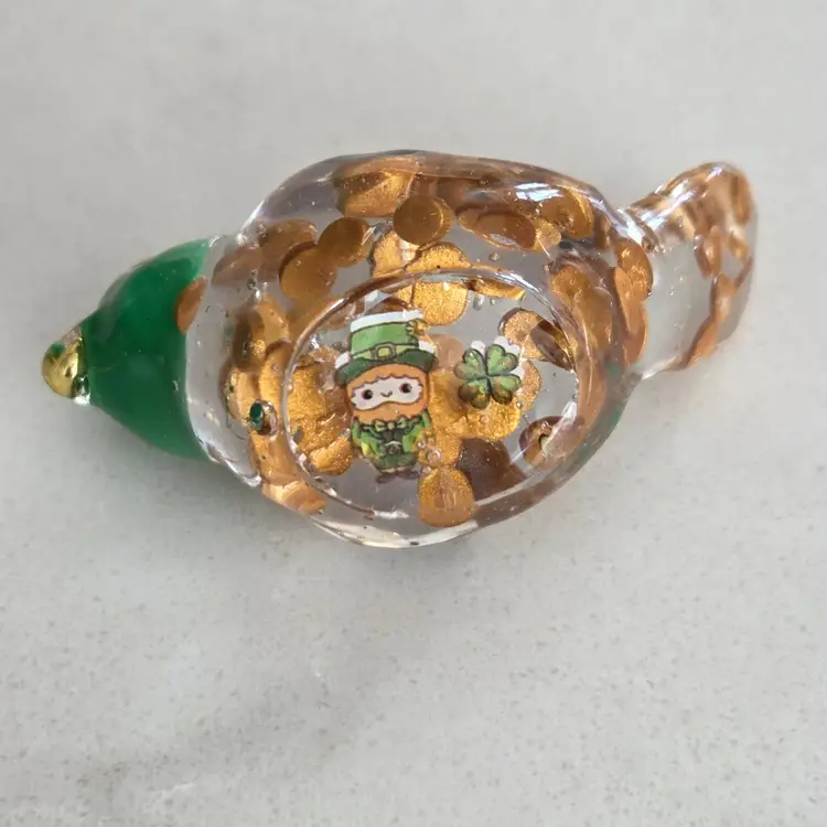 This lad is made with a gold seed bead beak, a green bead head, two pots of gold sticker wings that spills over into his body and tail. Turn him upside down and you will find a little lucky clover and that mischevious little leprechaun 🍀.