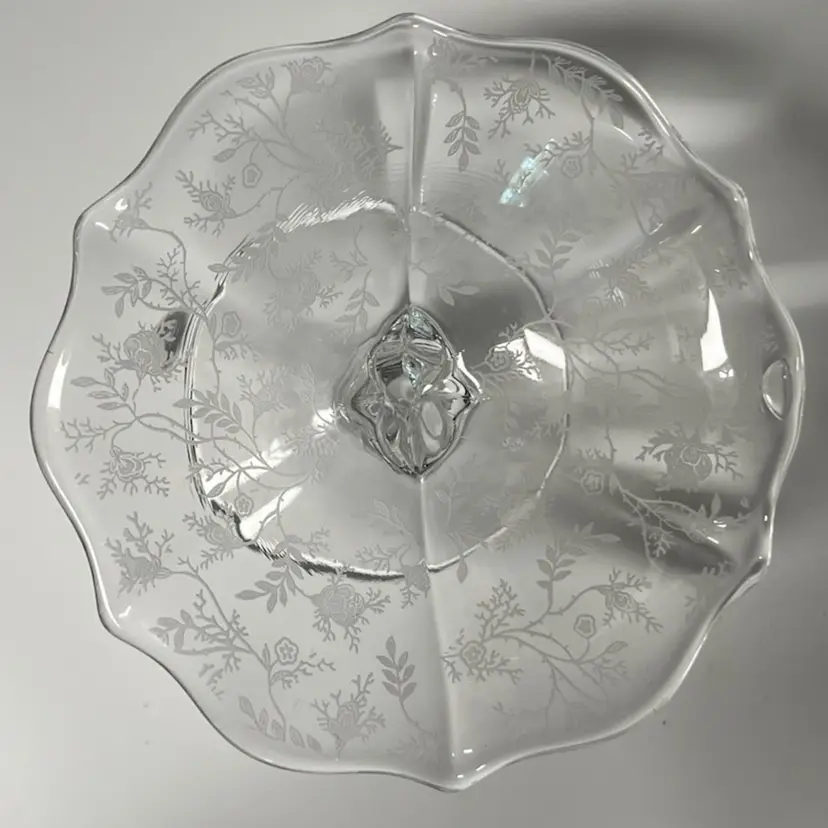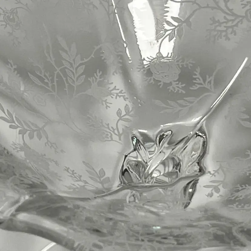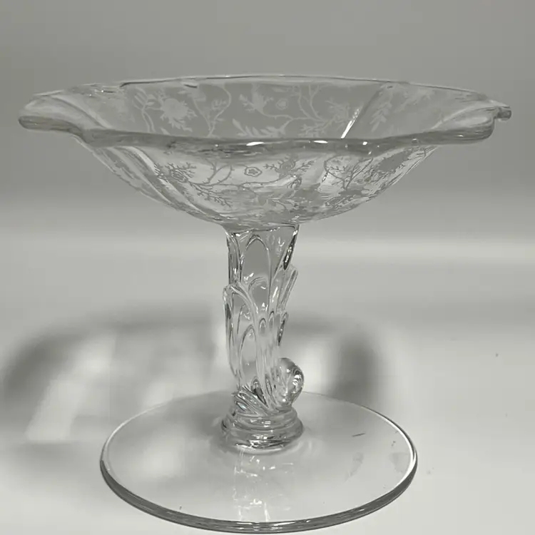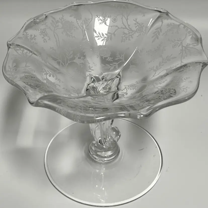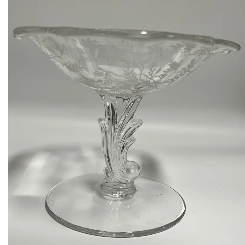 Fostoria Baroque Footed Compote with Chintz Print Etched in Bowl- 4.5” Tall, 5.5” Diameter