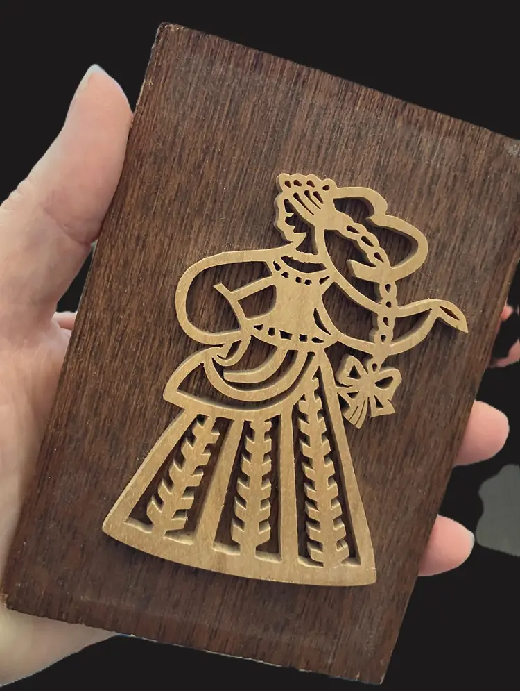 Dimensions: Overall 5" by 6 1/2". Wood piece: 3 1/2" by 5". No condition issues.