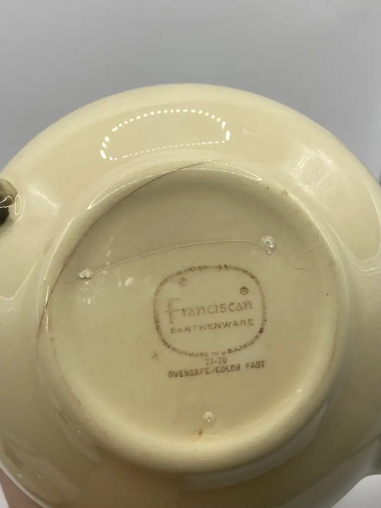 This beauty is a nice teapot with the rose pattern that doesn’t have a blemish, however, it has 2 cracks in the bottom. I cannot feel the cracks on the inside or outside of pot, so it’s under the glaze. Because of this, I’m selling it way below the comparable price.