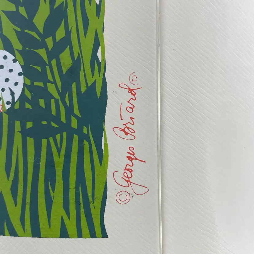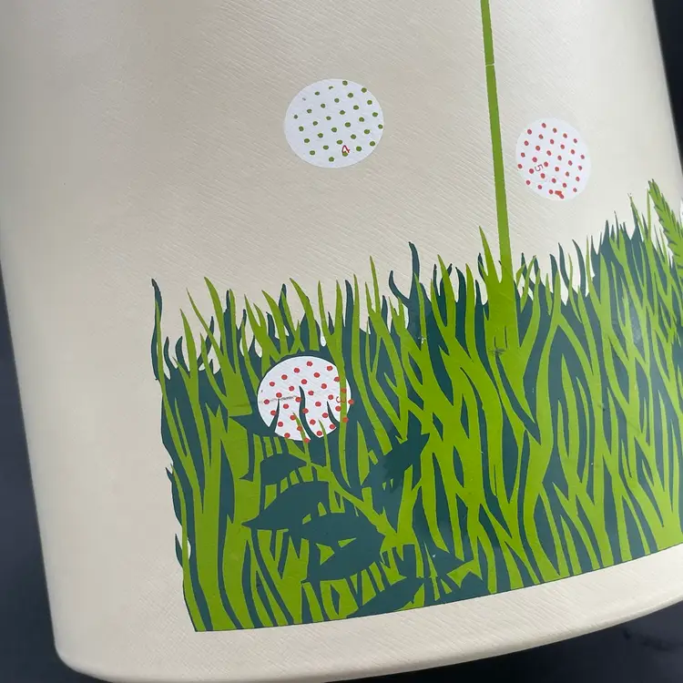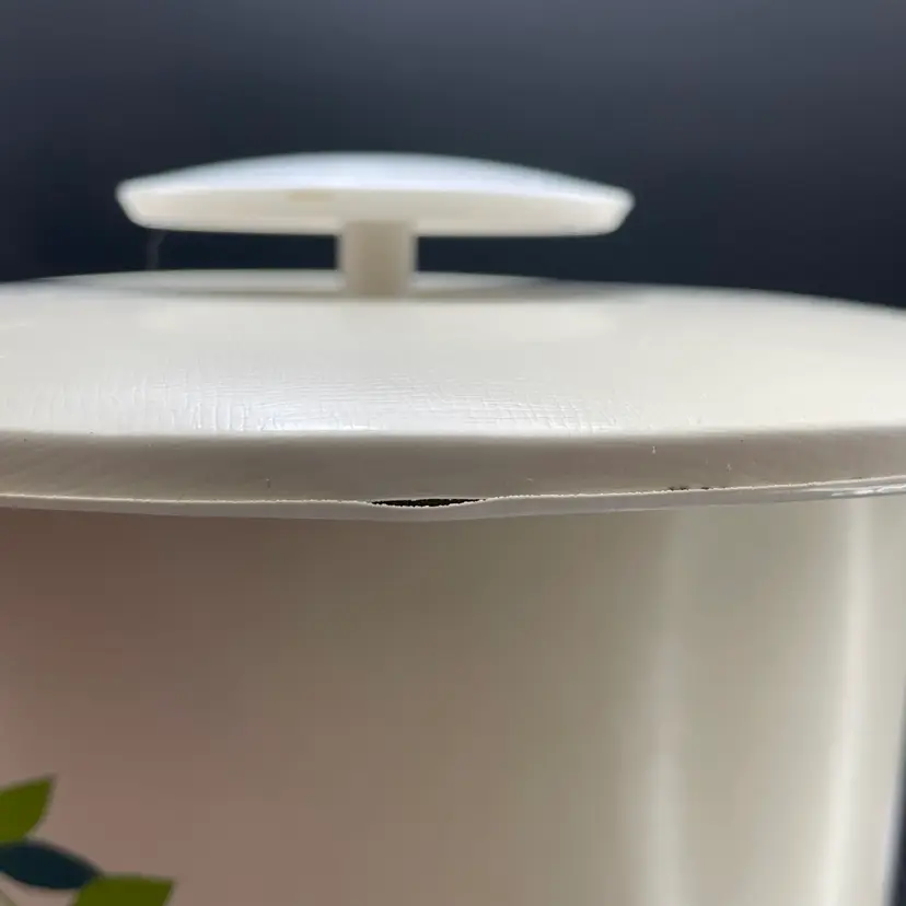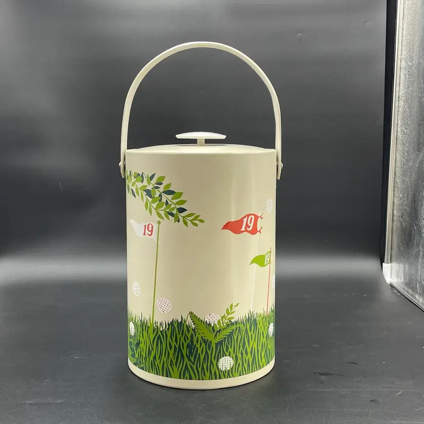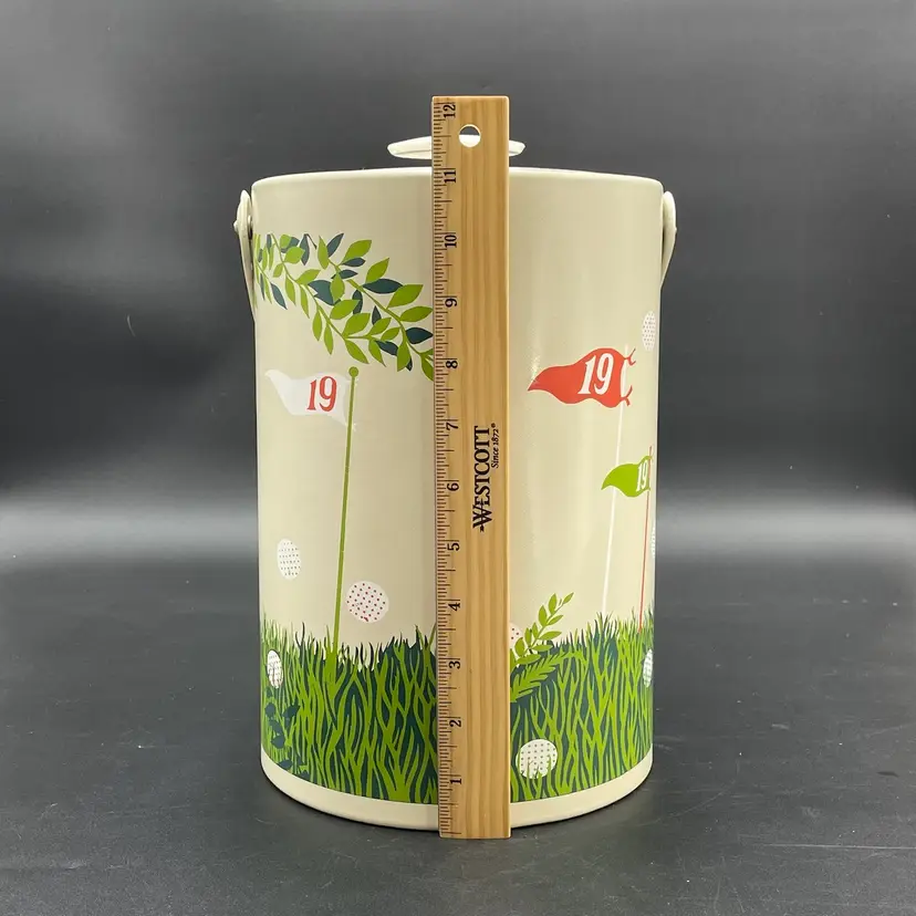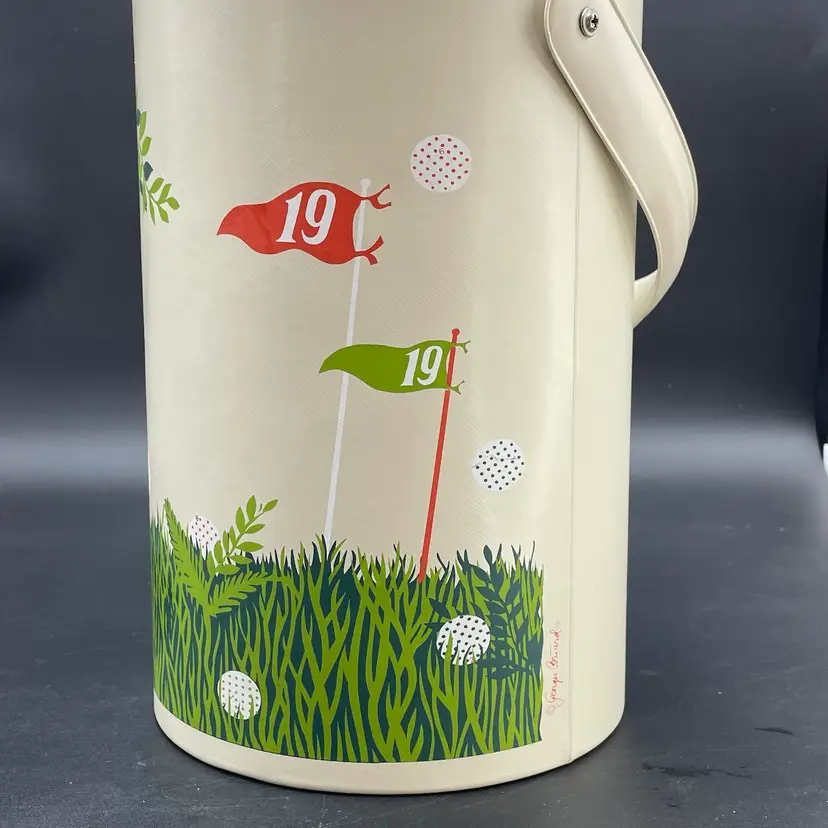 This is a rare Georges Briard Hole 19 golf themed vinyl ice bucket. Signed on the side. Measures approximately 11" tall x 7.5" across. There is a few very minor flaws due to use such as a scratch on the lid handle, and a small separation on the lid as shown in pictures. No other major flaws.
