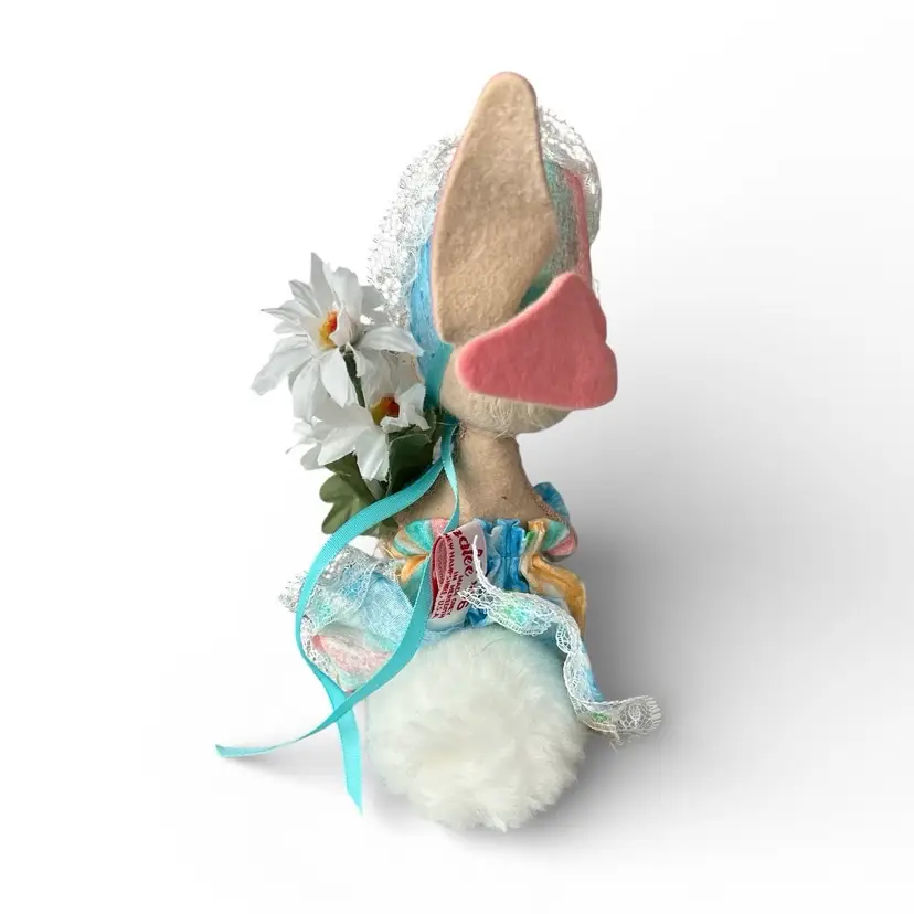 This adorable vintage bunny doll, dressed in a charming bonnet and holding a bouquet, adds a whimsical touch to any collection. Perfect for lovers of unique, handcrafted decor. Size: 7"