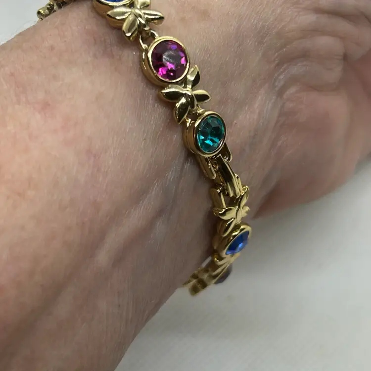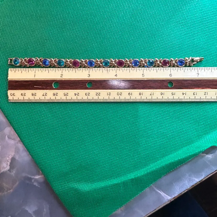 Multicolored glass stones in gold-tone Xs and 0s. Not signed. From the 1990s. Please see photos as they are part of the description. Thanks for looking!