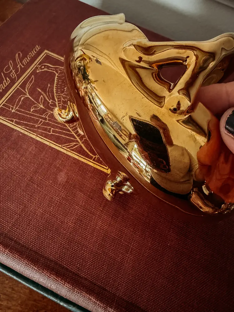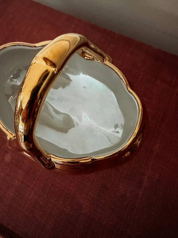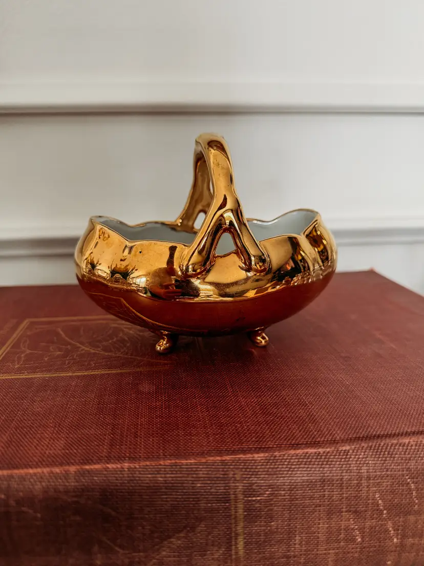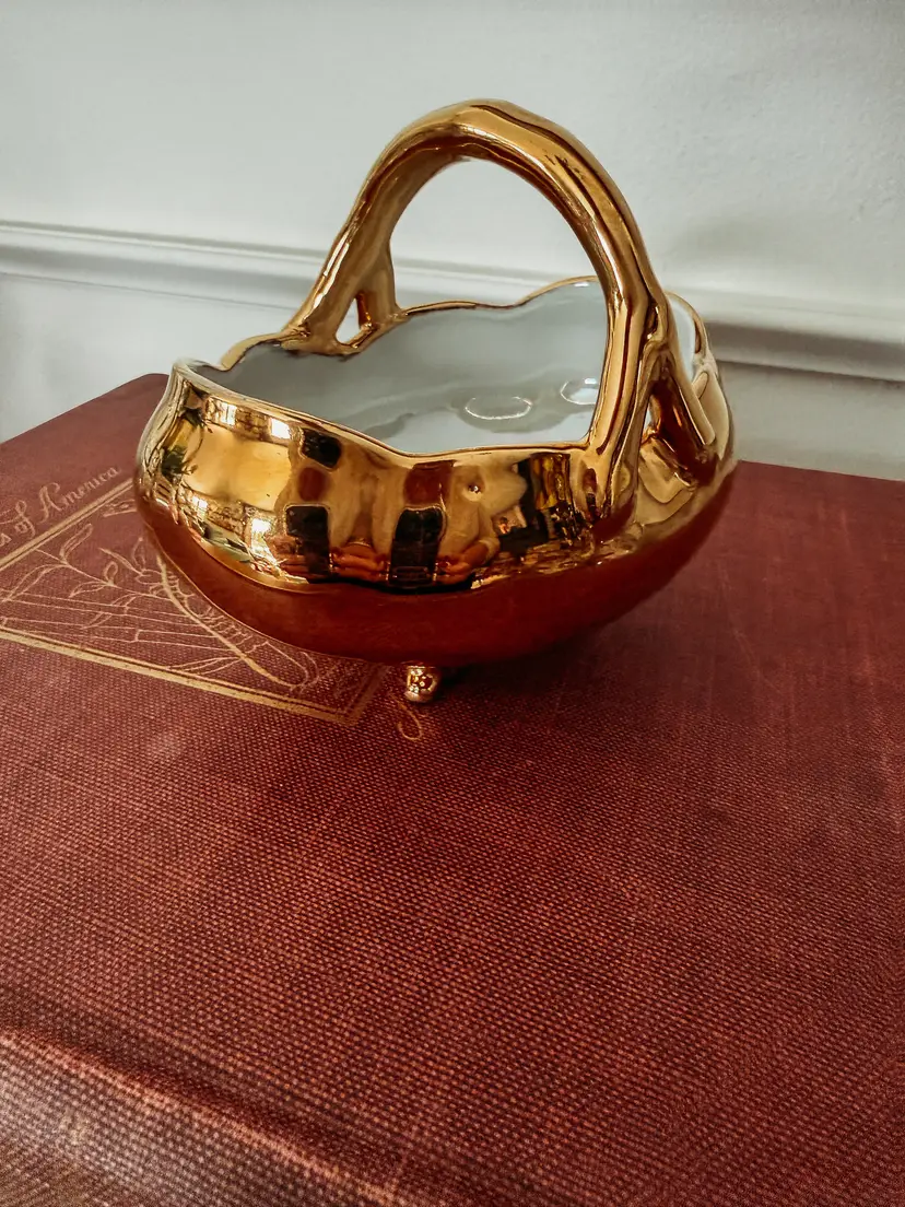 Gold LUSTER w white iridescent interior Footed ceramic basket In amazing condition and absolutely gorgeous!