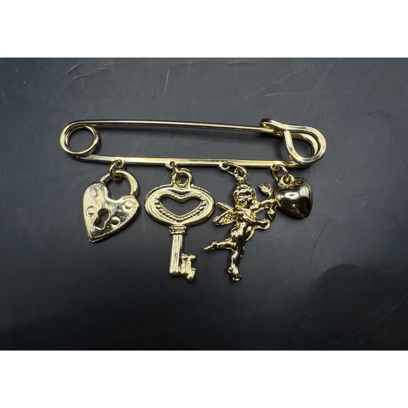 Gold-Tone Safety Pin Brooch w/ Lock, Key, Cupid, & Heart Charms