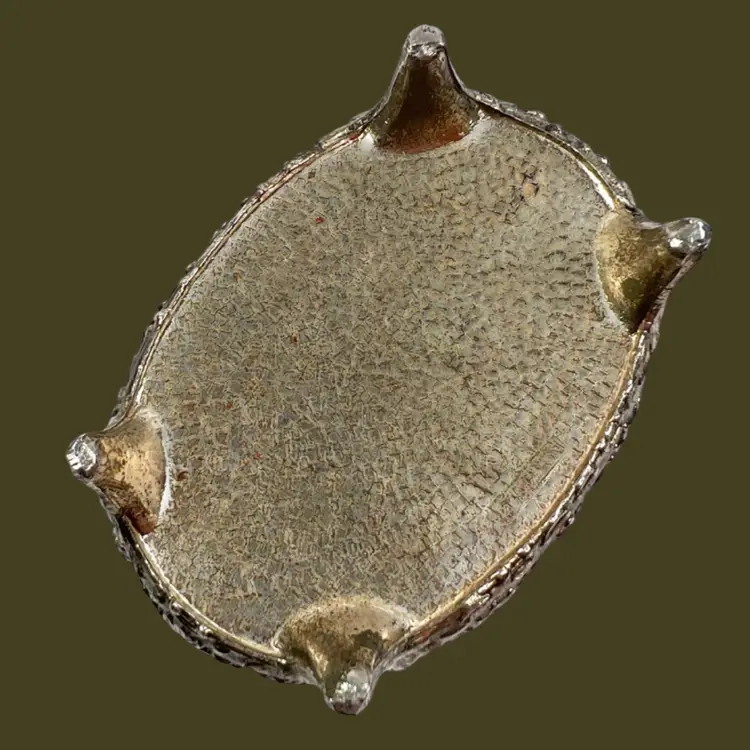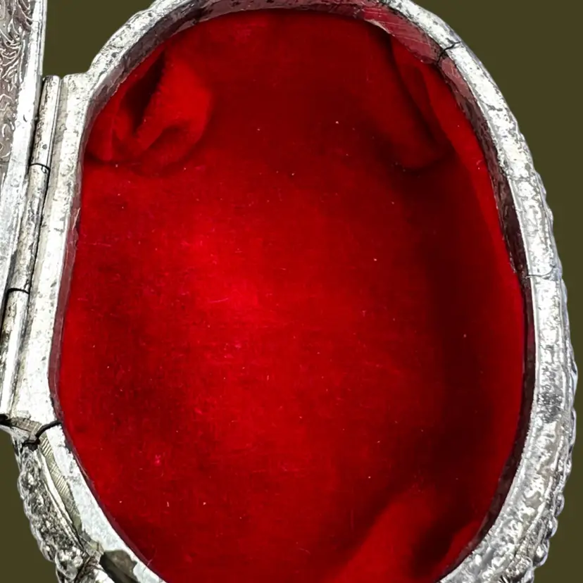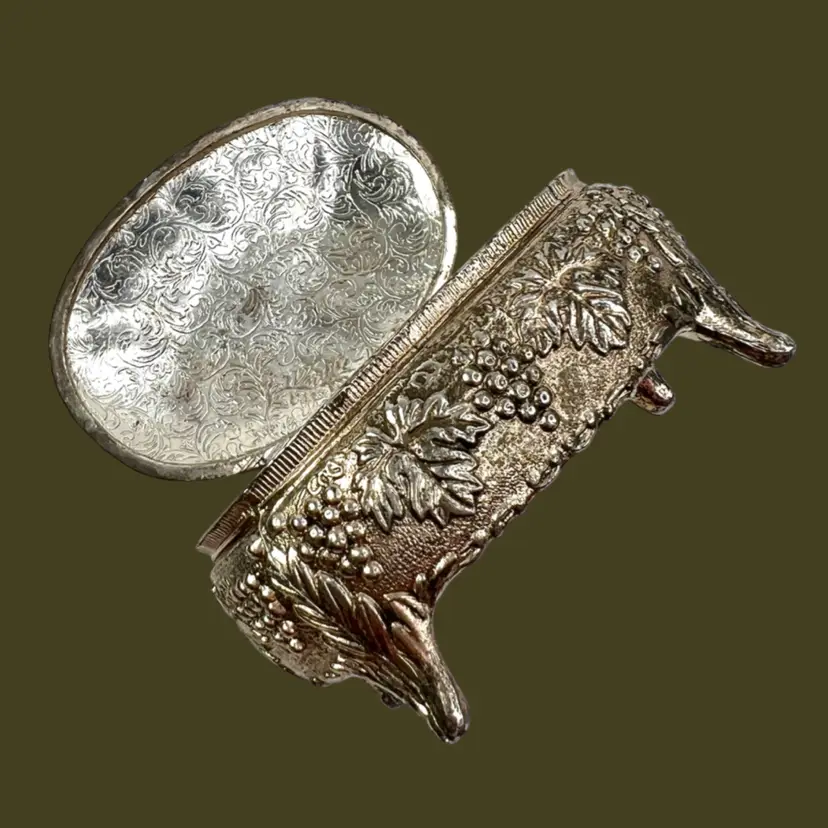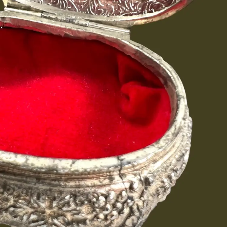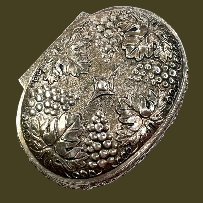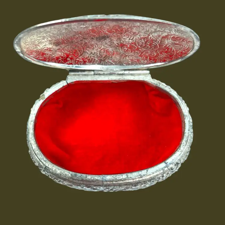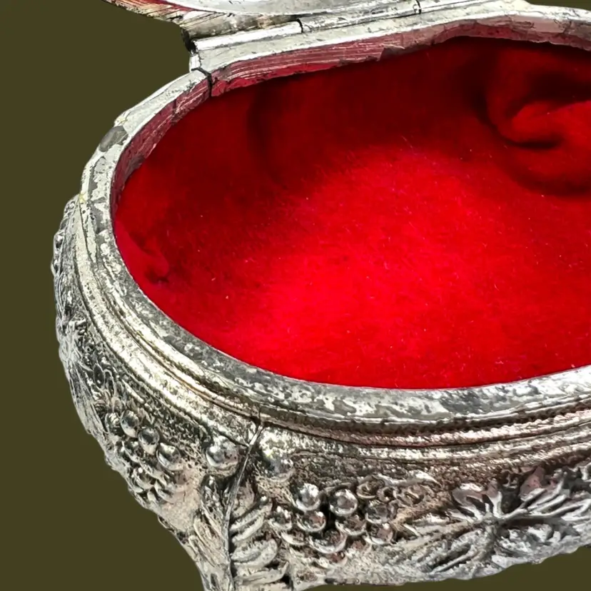 Grape Leaf & Vine Silver- tone Lidded & Footed Jewelry Trinket Box Bright red velvet lining Marked Japan on bottom 3-1/8" L x 2-3/8” W x 1.5"H Weighs 5 ounces Condition: Natural patina; tarnish & peeling on interior of lid and a little on interior feet