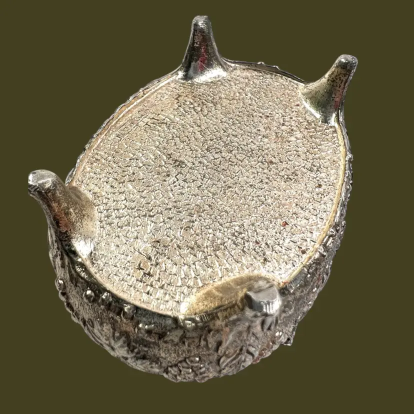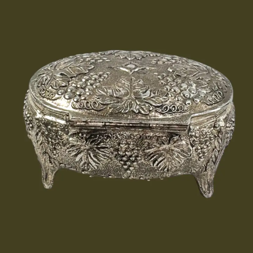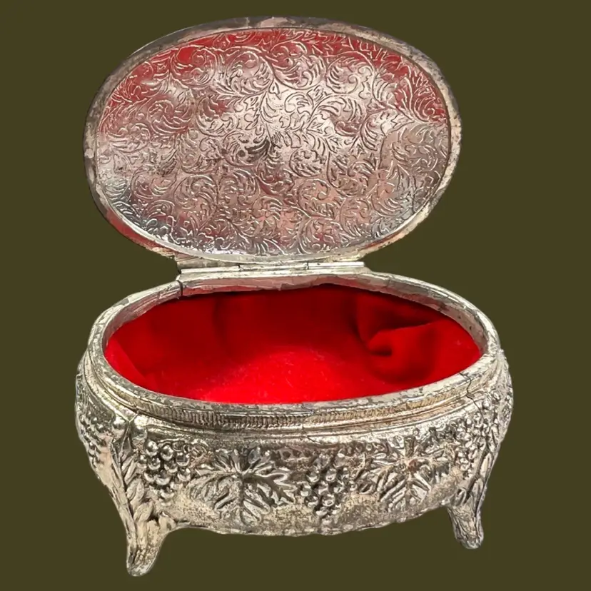 Grape Leaf & Vine Silver- tone Lidded & Footed Jewelry Trinket Box. Bright red velvet lining. Marked Japan.
