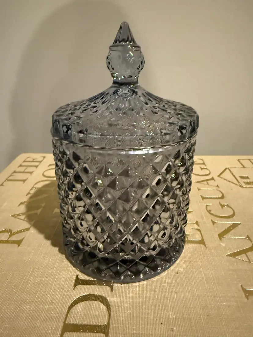 Sizikato Grey Diamond Faceted Glass Apothecary Jar with Lid — elegant storage for jewelry or candy. This beautiful smokey grey glass container features a textured hobnail diamond pattern that catches the light beautifully. Perfect for vanity organization, bathroom storage, or as a decorative kitchen candy dish.