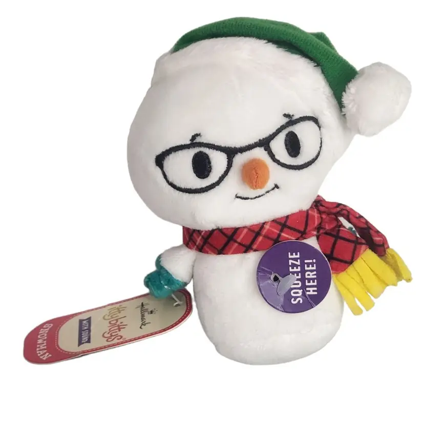 This Hallmark Itty Bittys Snowman Plush combines soft textures, festive design, and sound features to spread holiday joy. Wearing a green hat, glasses, and a red plaid scarf with yellow fringe details, this cute and compact snowman makes the perfect collectible or gift. It is equipped with a sound function activated by a simple squeeze for added interaction and charm. Its tasteful white plush material, accented in colors symbolic of winter festivities, creates a cheerful vibe. • Compact, lightweight plush design • Features squeeze-activated sound functionality - Plays 3 different Christmas phrases. • Festive red, green, yellow, and white color scheme New with Tag, some creasing on tag. Tested and works. Includes nonreplaceable batteries - life of batteries in not guaranteed.