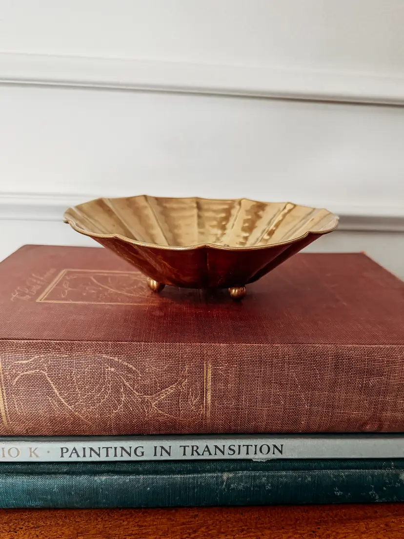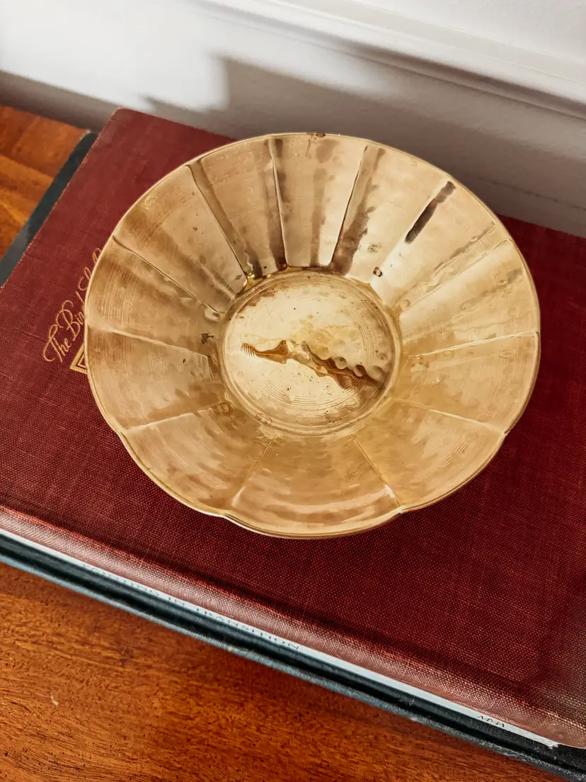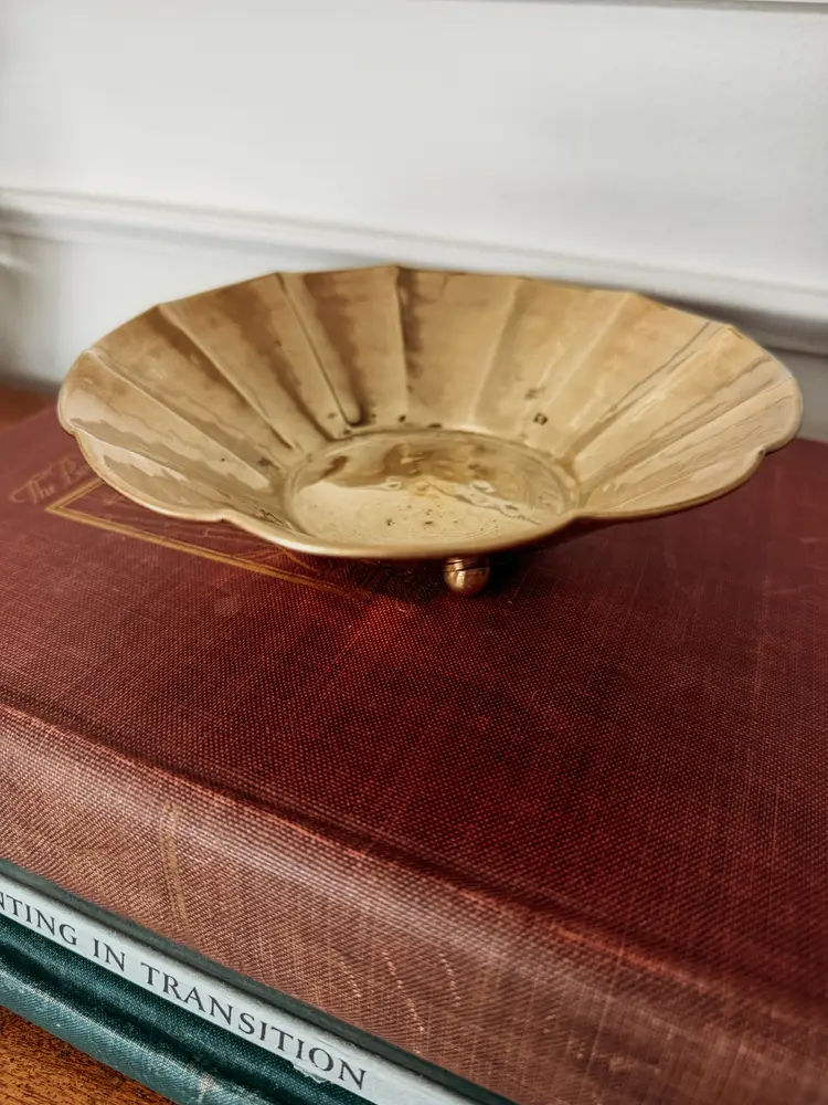Freshly cleaned and polished, this scalloped dish is a beauty! Hammered brass with a "made in india" sticker on the bottom. 7" wide, 2" tall