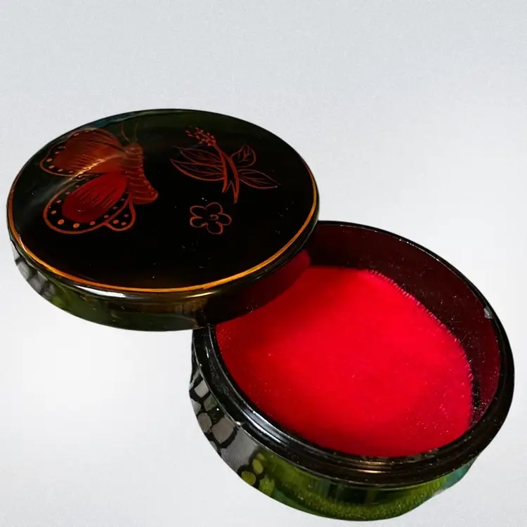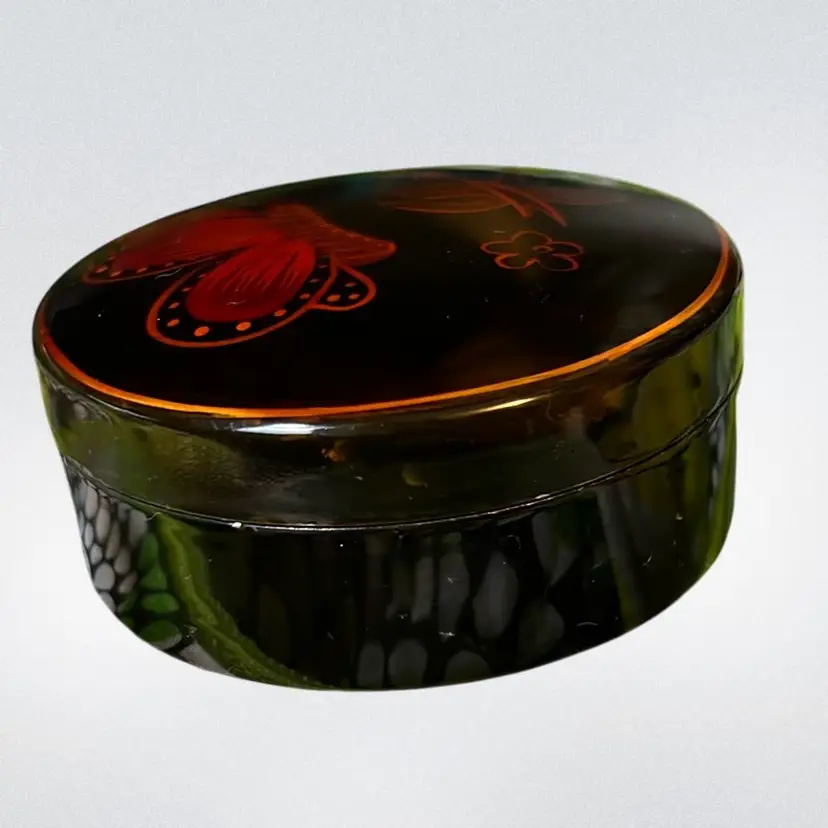 Pretty orange red painted butterfly & blooms in a lacquer trinket box.