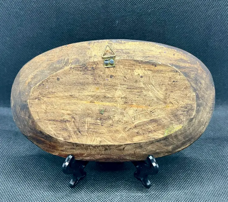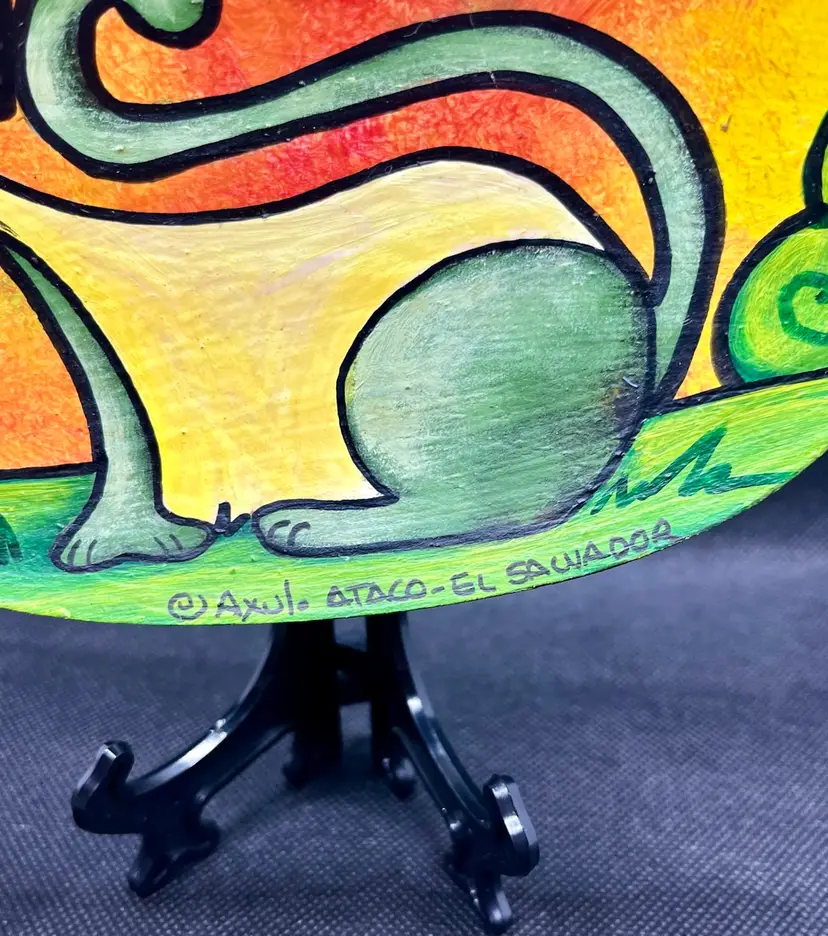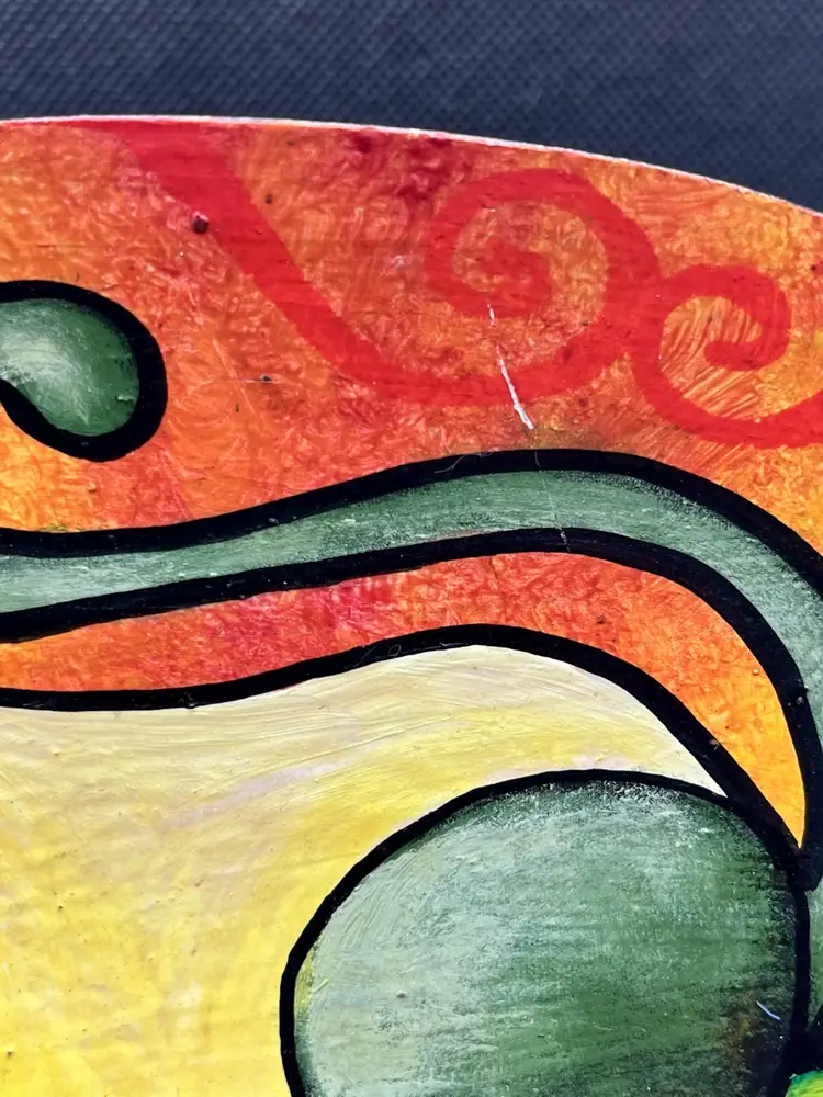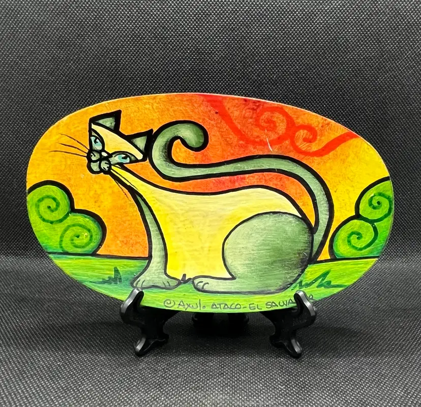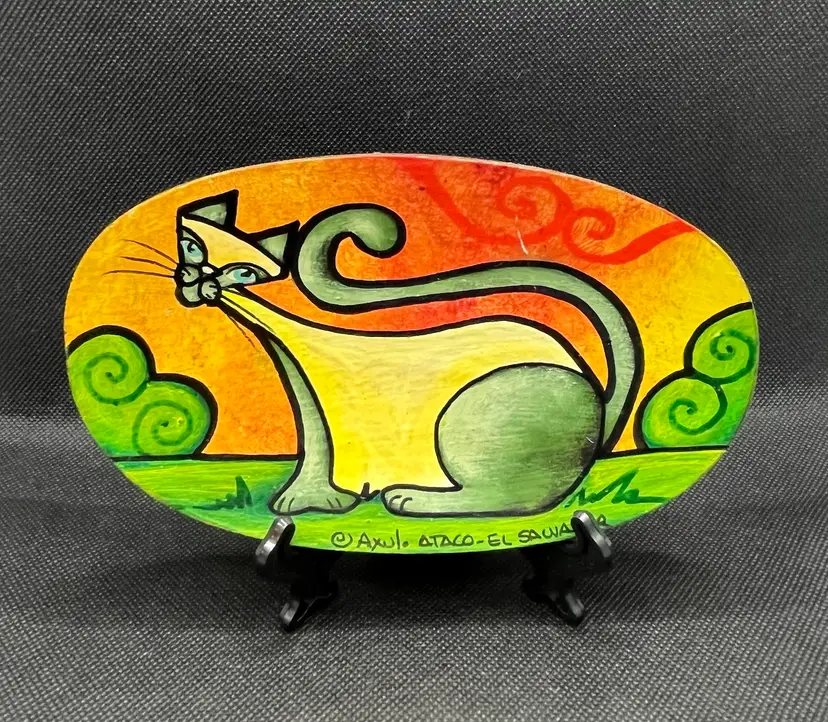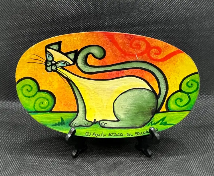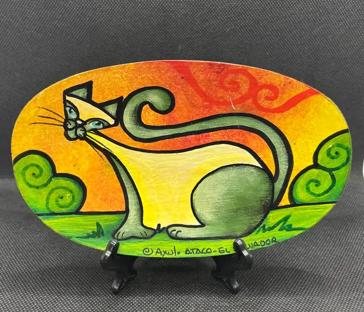 Hand Painted Small Wooden Wall Plaque Whimsical Cat Painting Folk Art . The artwork features a stylized cat with a whimsical design. The vibrant colors and bold lines are a key feature of this artistic style. Approximately 6.5” x 4” with minor surface wear and scratches. See photos.