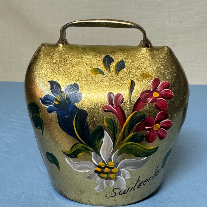 Hand-painted Swiss cowbell featuring alpine flowers and "Switzerland"