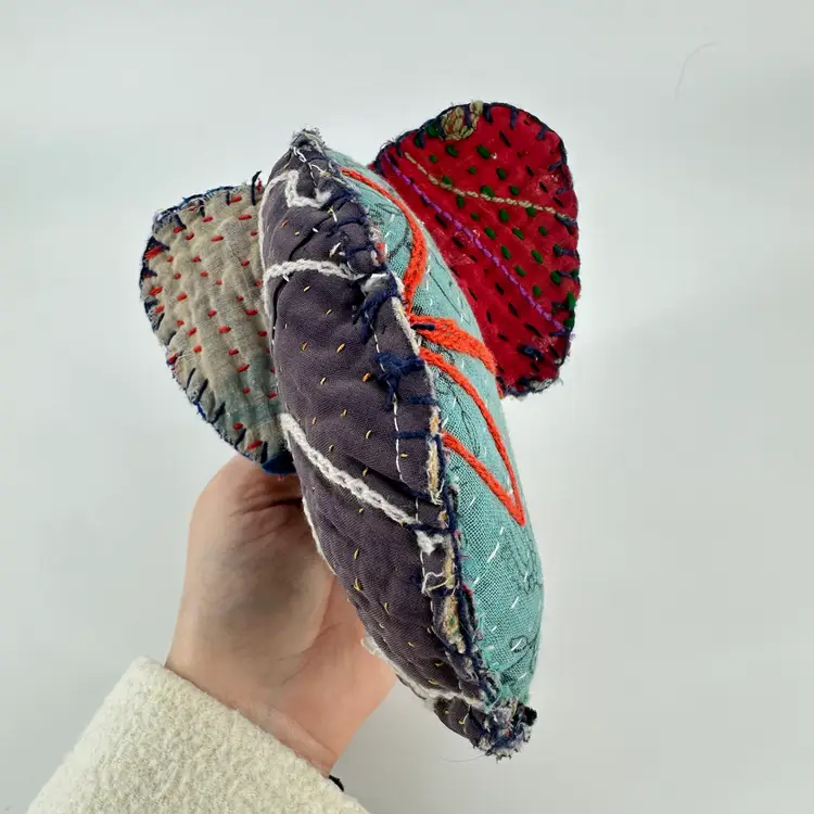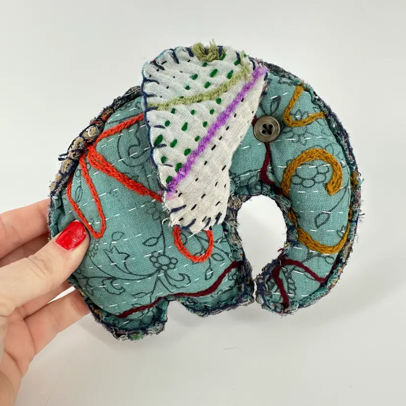 Handmade elephant plush made with boho style stitched fabric and button eyes. No rips tears or stains. Elephant measures approximately 6” long by 4.5” tall. No markings or signatures.